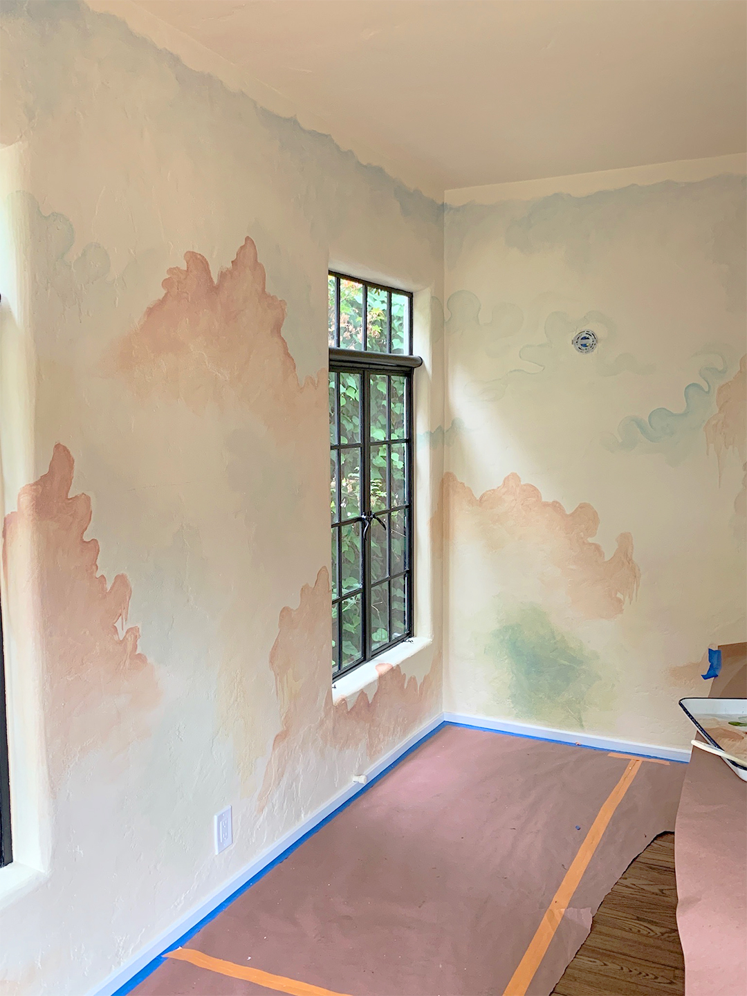 Super diluted. I wanted it to feel a little plastery, a little fresco-y. And one of the ways to accomplish that without actually painting on wet plaster is to use a diluted paint and a dry brush on top of that. It makes it look really faded.