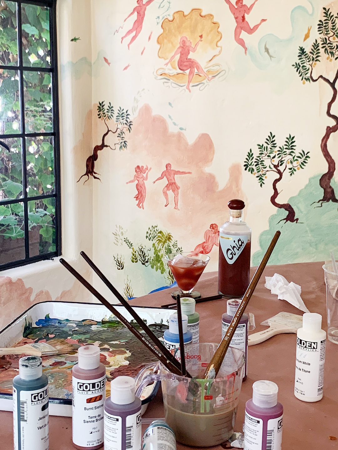 The walls were primed in Backdrop’s Disco Nap paint, so Donnelly, the creative director for hospitality group Ash, used that as a starting point for what he calls a “sun-drenched, craggy, rocky summer-beach experience” mural that gives off fresco vibes. We’ll drink (a NA cocktail) to that. Here’s how he made it happen.