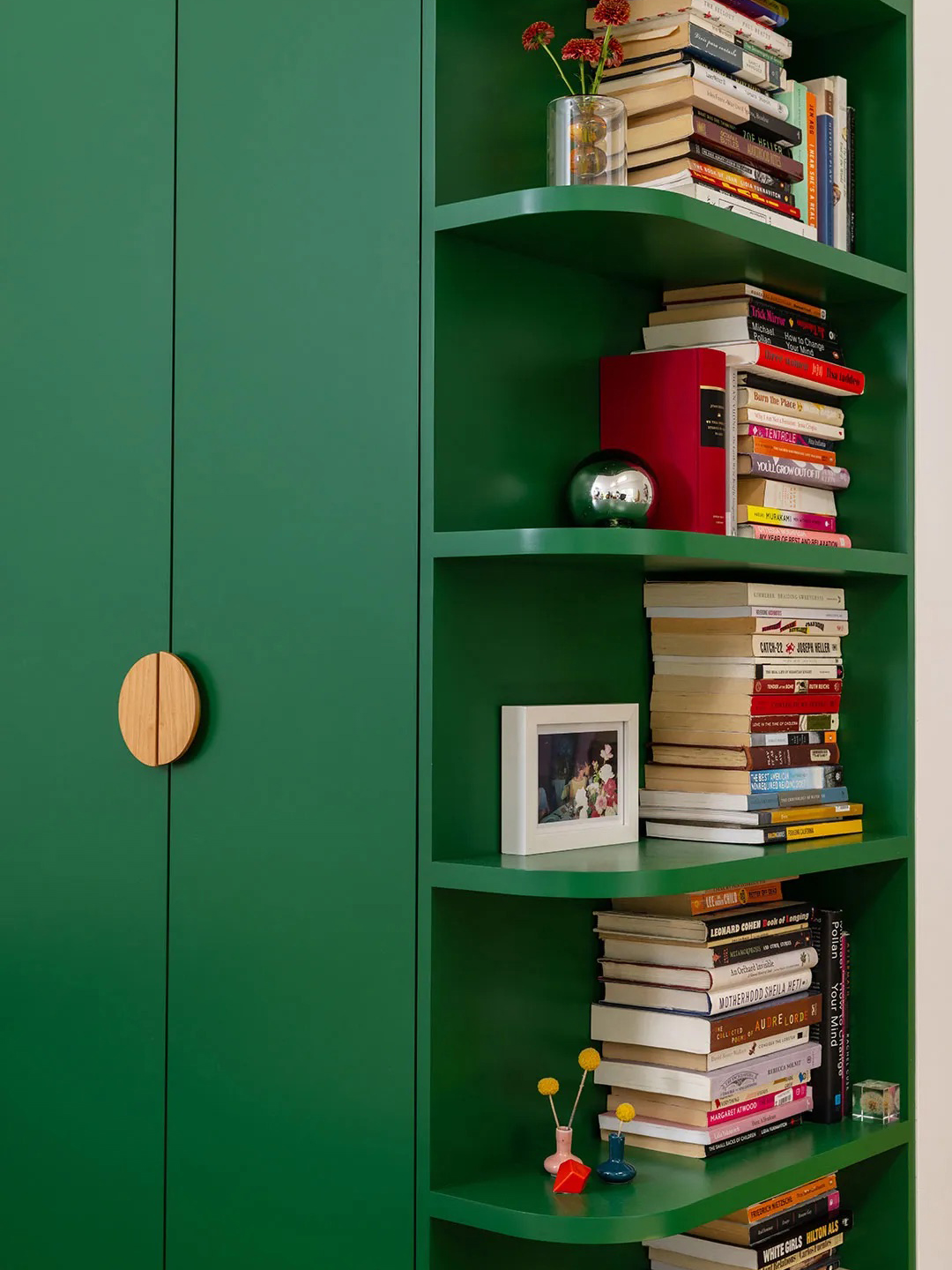 To answer our previous question, the answer might be stacking vertically and horizontally. Architect Emily Farnham’s bookshelf is a master class in just this. Using both methods also helps balance out the presence of big and small books. Add some plants and your favorite souvenirs, and you’ve got a full scene.