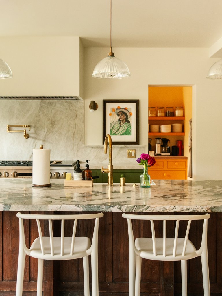 Then, of course, the kitchen falls against a backdrop of real greenery, thanks to the new cold-rolled steel casement window system that connects the interior to the garden. There’s a small bar countertop on the other side, so the couple can easily chat with friends or pass snacks when the weather is nice. “It’s a kitchen designed so that two people can work together and not be in each other’s way,” says Clukies, pointing to the two different sinks and ample countertop space inside.