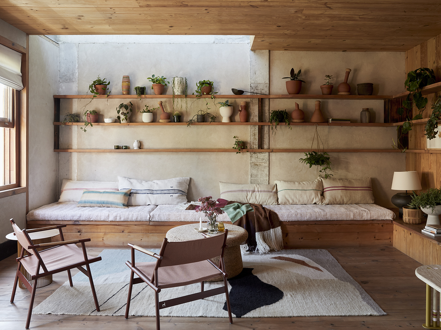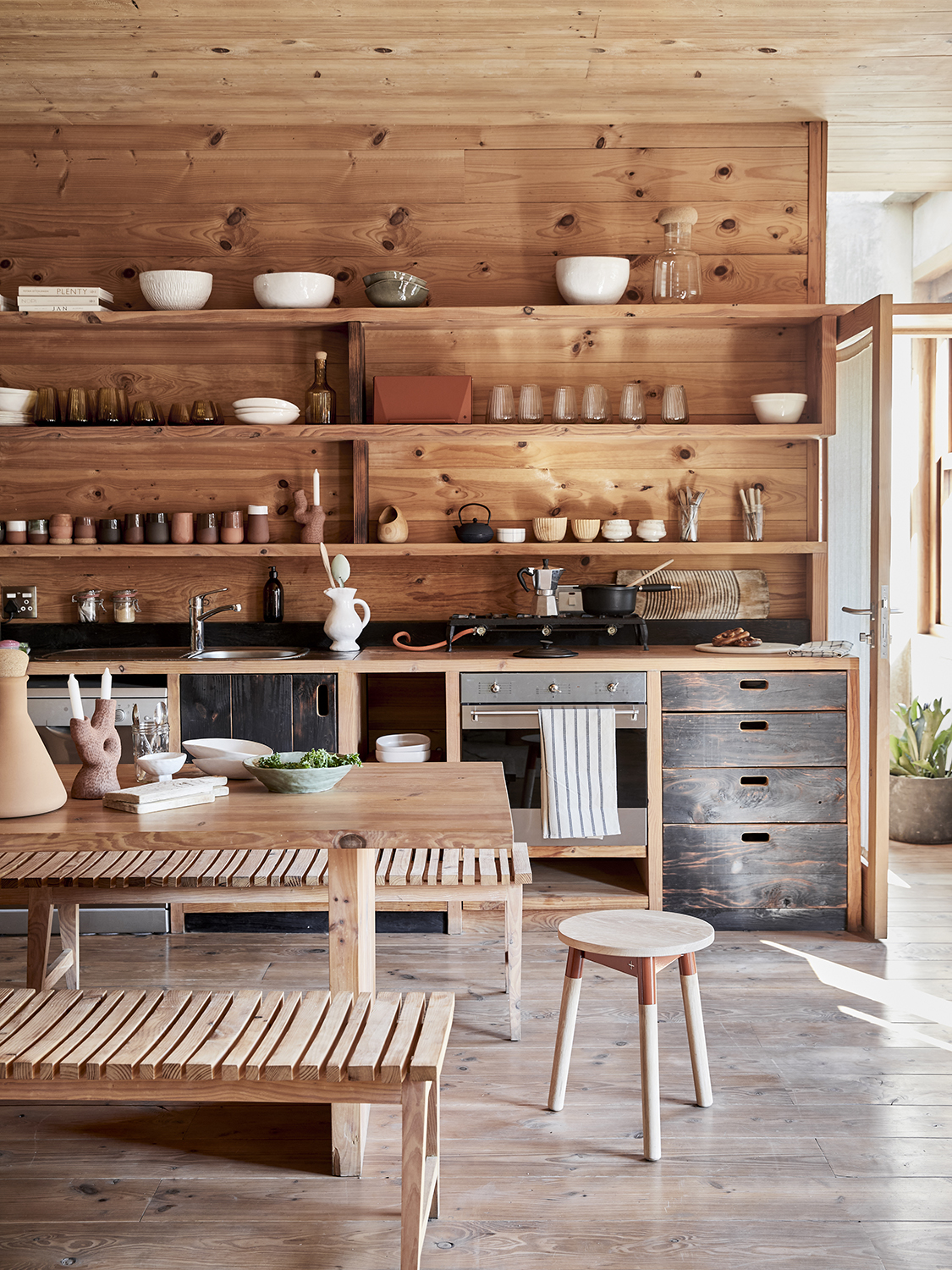 The largest pieces of furniture are designed for surplus things and people. In the bedrooms, Wolf situated the mattresses on platforms with cubbies underneath for extra linens. The built-in sofa in the living area maintains an uncluttered feel and doubles as an additional sleeping space when friends stay the night. Almost everything else, with the exception of the tables and benches, was sourced from local makers, like the cork stools by Laurie Wiid van Heerden of Wiid Design. “They’re tactile, handmade, and super-versatile,” notes Gardiner. Sometimes the best home finds come from the most unexpected materials.