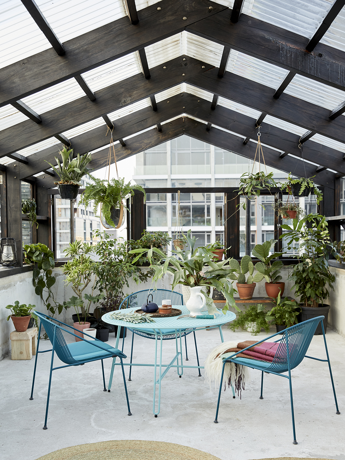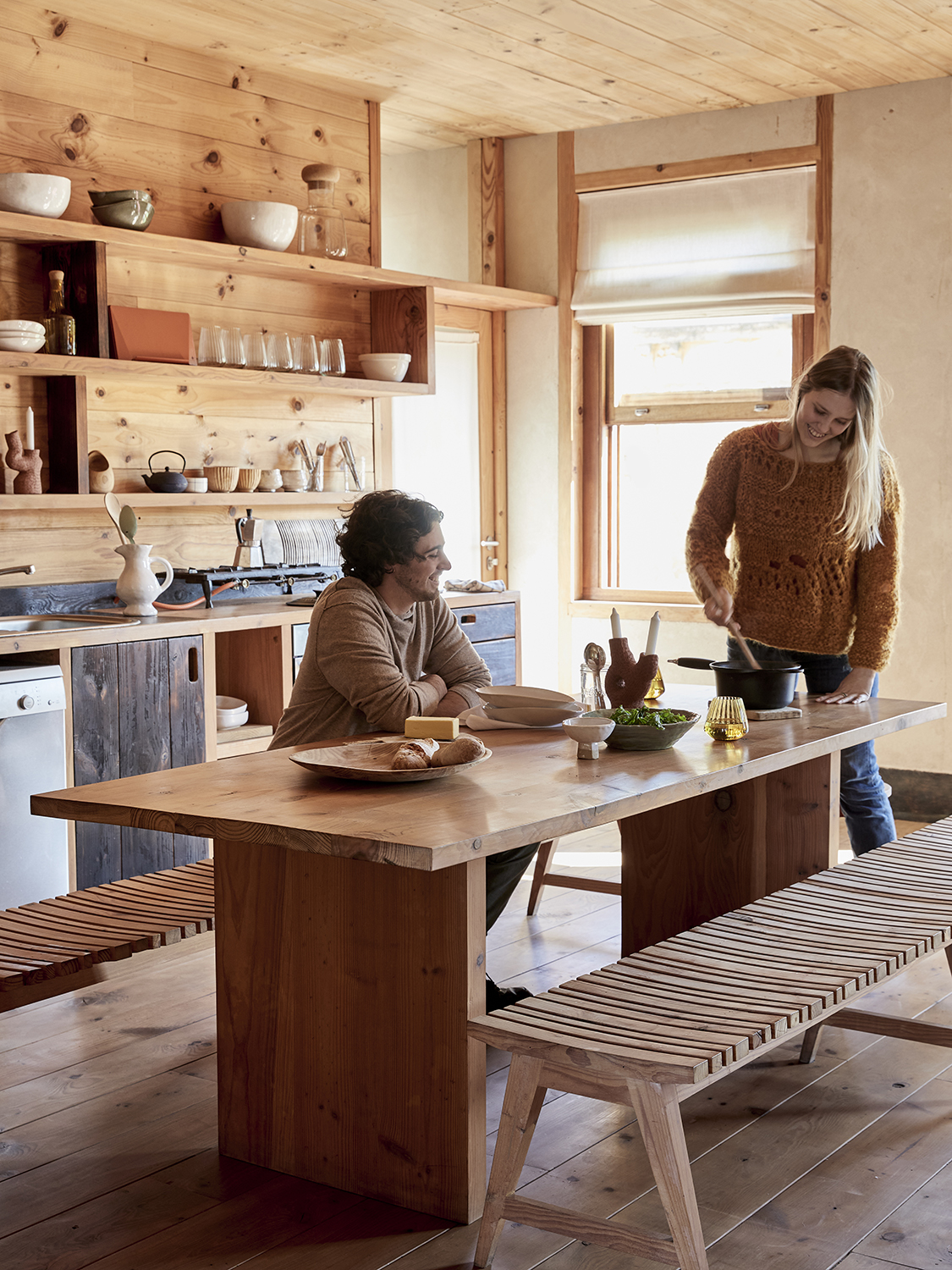 The second floor is shared by Wolf’s copywriter son, Jade Gadiner, and his chef friend, Tanya Cooper—the green thumb of the group. “I love to grow my own food as much as possible,” shares Cooper. While most of the interior wood has been left untouched, they stained the lower cabinets and backsplash in the kitchen, embracing uneven and exposed strokes and accentuating the handmade look. Throughout the space, mohair blankets by Frances V.H add a layer of coziness and color to an otherwise monochromatic setting.