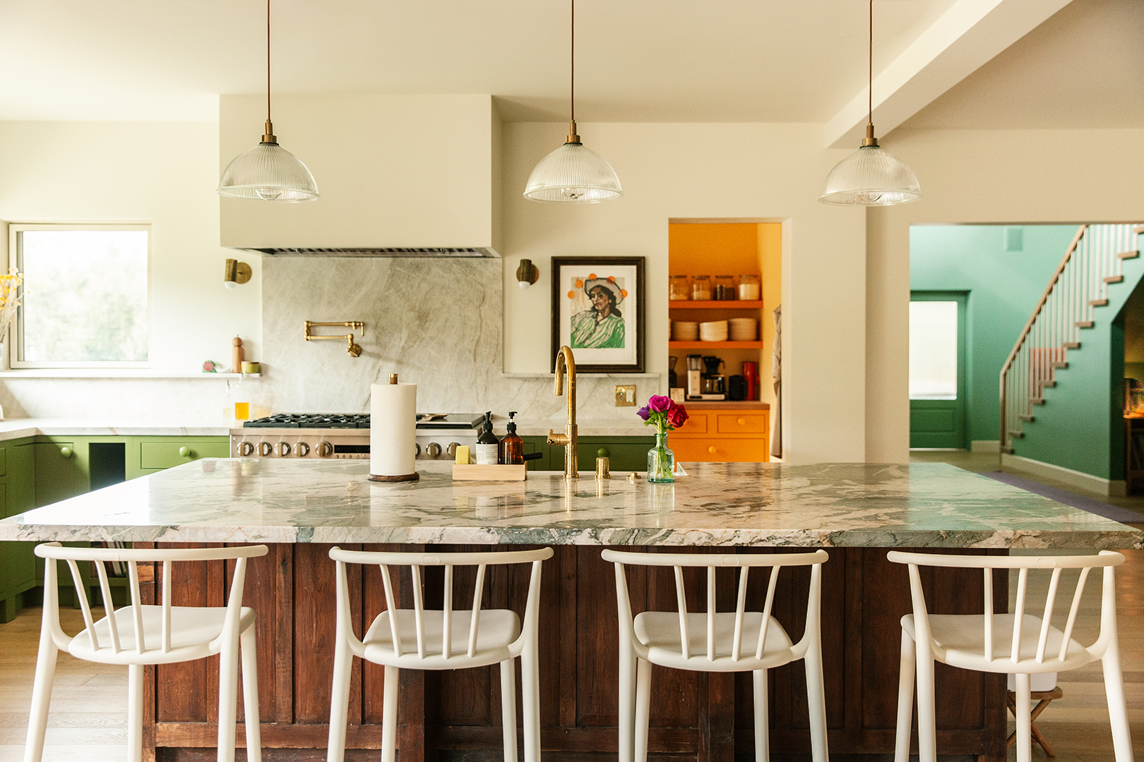 Once the interior walls were installed, Maggie had some serious fun with paint, introducing shades ranging from dusty pink to chartreuse. She plucked a hue called Relentless Olive for the kitchen cabinets, mostly because her 11-year-old daughter’s name is Olive. When she went on the hunt for a Malm fireplace for the living room, she opted for a reissued marigold shade that reminded her of her grandmother’s favorite color.