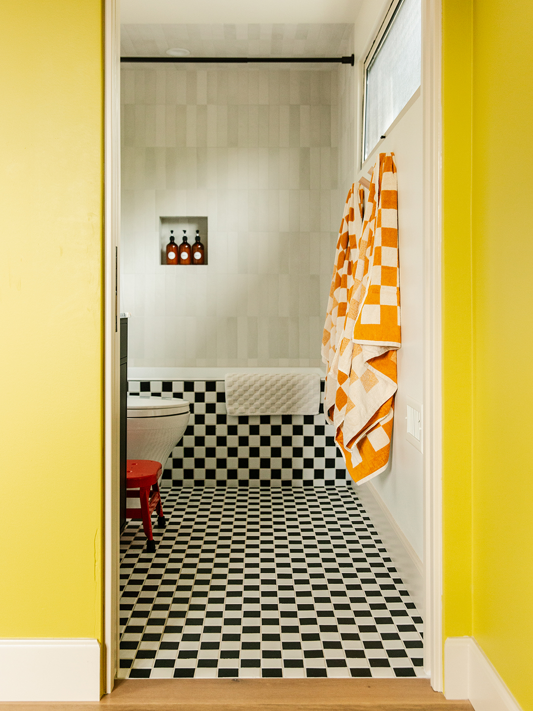 Maggie found budget-friendly ways to incorporate the rainbow in the bathrooms, too. While new Heath tile wasn’t in the cards, discarded ones from the Northern California–based brand were. She traveled to Sausalito to check out Heath’s “seconds room,” which is basically a large shed filled floor to ceiling with discounted tile (some of it is surplus from jobs; others have slight imperfections). She spent seven hours searching for the right number of tiles and colors she’d need to create a plaid design on the guest bathroom floor. “One woman kept coming in to check on me and ask me if I was okay, if I needed water,” says Maggie. She then found a driver to deliver the pieces to Santa Ynez, where she laid them out by hand to show her installer exactly how the pattern should look.