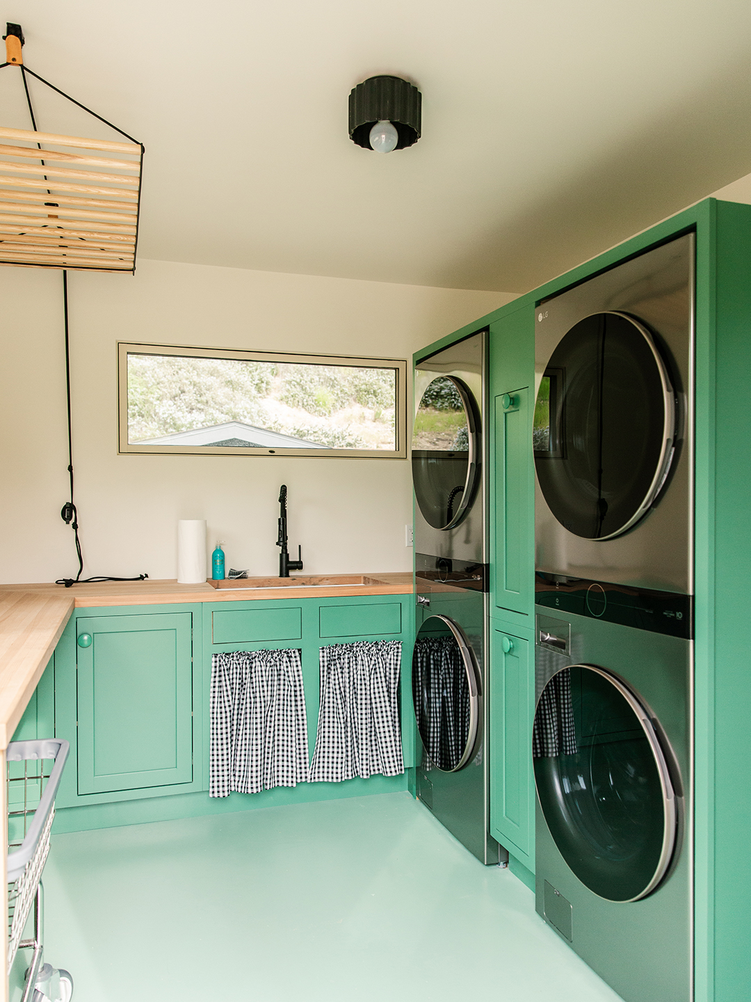 After weekends when every bunk and trundle bed has been occupied by a guest or kid, Maggie doesn’t stress over the cleanup. By outfitting the laundry room with double washer and dryer stacks, she can get most of the bedding stripped and clean in one go. “I genuinely love laundry, but I don’t want to sit here waiting for sheets to dry,” she says. The setup is also a lifesaver now that they’ve listed the house as a long-term vacation rental.