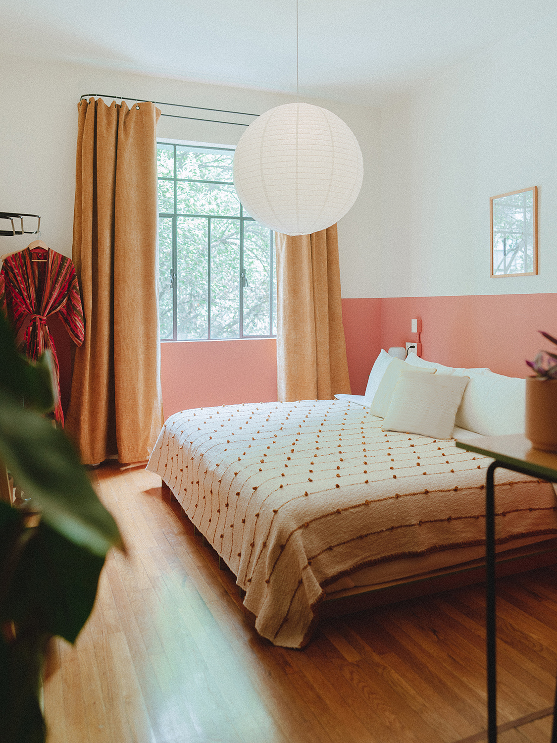 So they went to Comex, a Mexican paint company, and stocked up on the vibrant coral shade Emilia, then applied it halfway up, right to where the wall changes textures. Henney was lucky to have a natural line to follow, but she says if you are trying the look in your own home, painter’s tape and a level would give you a similar payoff. (“Just be extra-careful when you’re pulling back the tape so you don’t take the color with you,” she adds.)