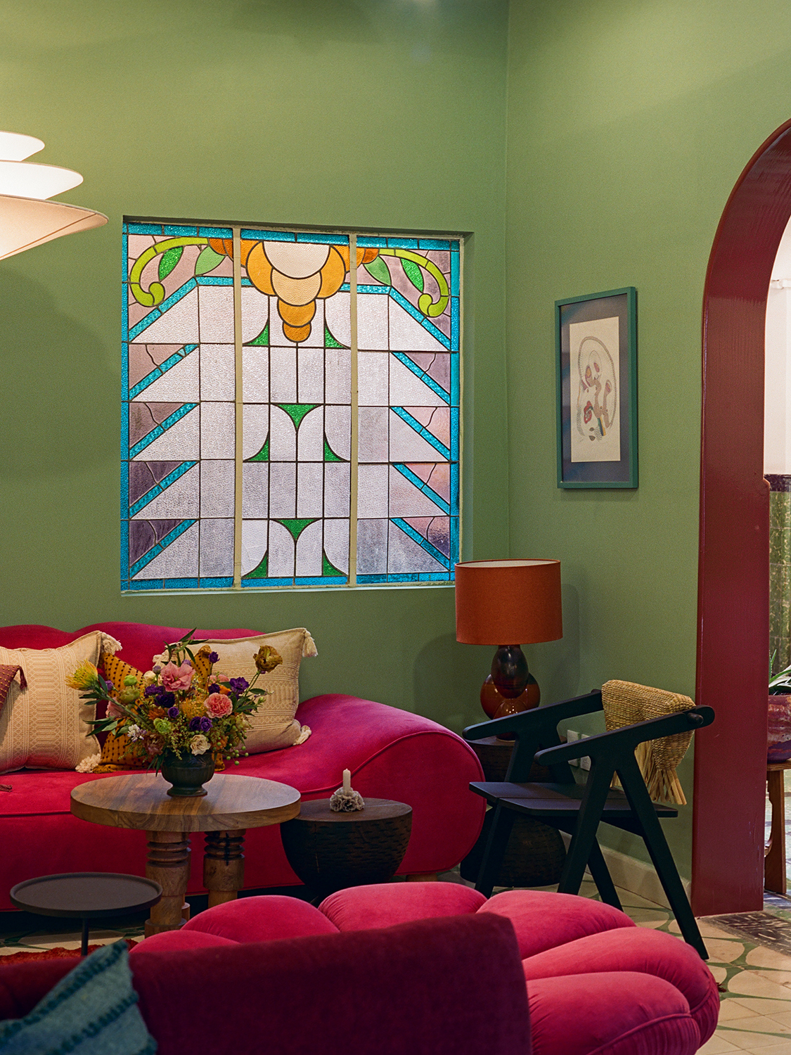 Keeping original details from the 1947 structure—stained-glass windows, curved breeze-blocks, an exterior shade—was important to Paige Henney, director of design at Bunkhouse Hotels, who worked with local architects and contractors to transform the space’s style, which she calls “a Mexico City version of Art Deco,” into a workable hotel. But those pink walls? All new.