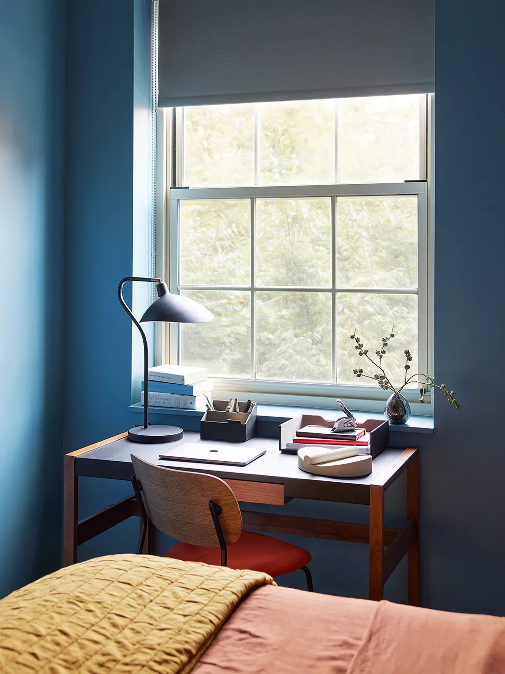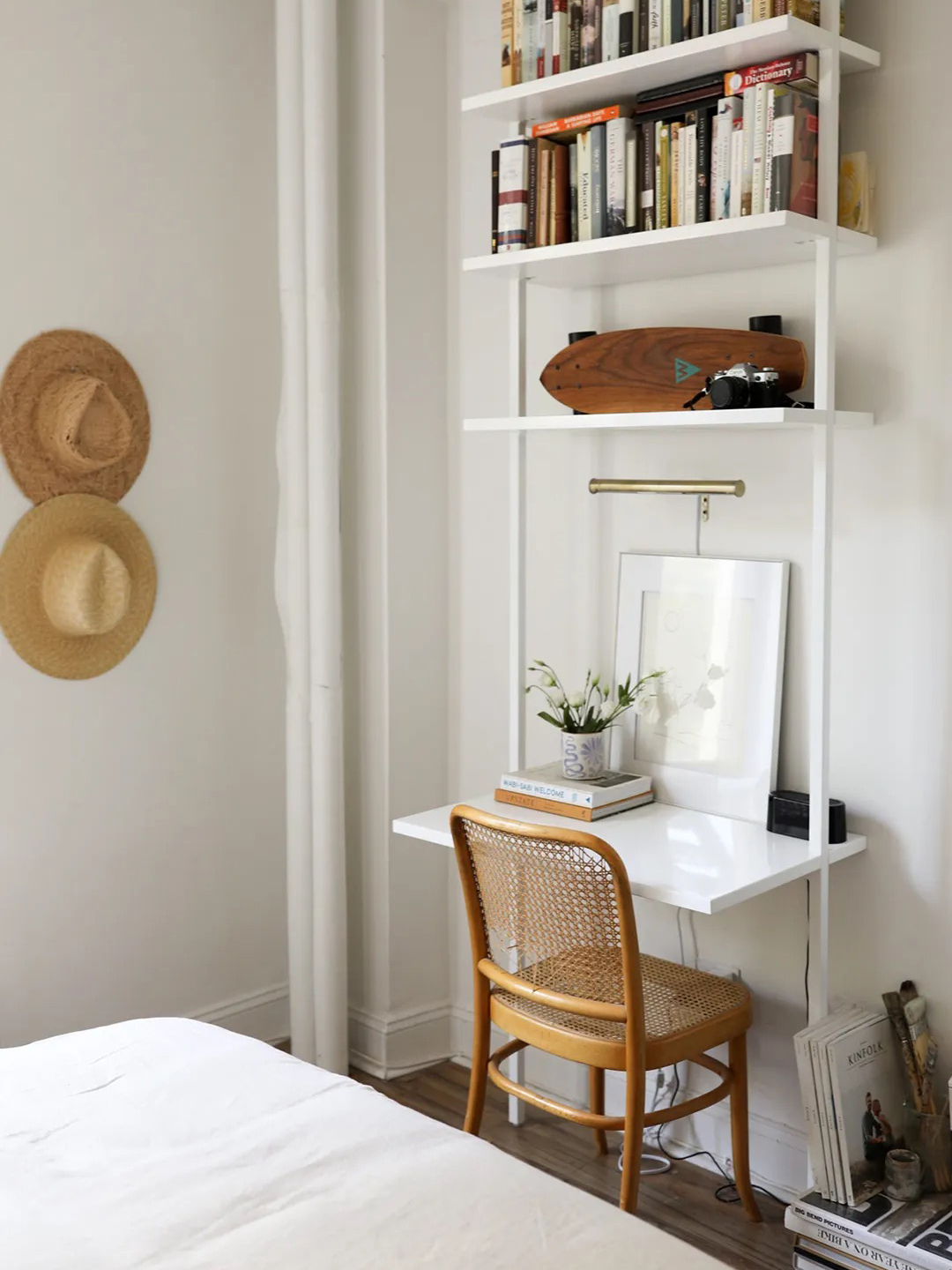 To keep the peace in her family’s 600 square foot New York City apartment, Heather Summers put a slim desk from CB2 in their bedroom so her husband could have a place to study for law school in the evenings. The now-discontinued piece was just a mere 20” deep, leaving enough room to prop up a laptop without crowding the bed. West Elm, Hay, and Pottery Barn all carry similar configurations.