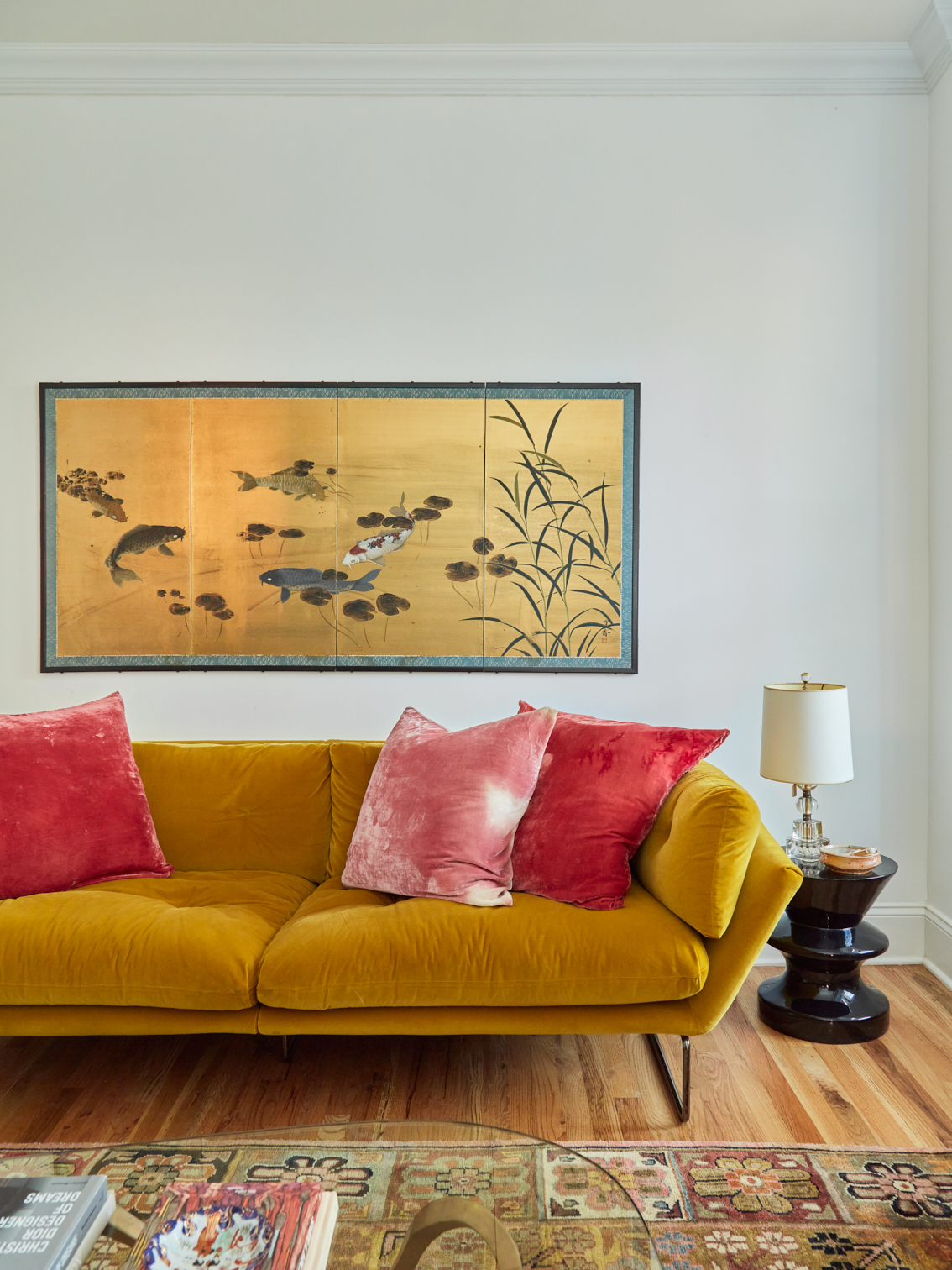 And just like a jewelry box, Behr’s apartment is a series of compartments. During her renovation five years ago, she had cabinets installed along the kitchen ceiling, stretching from one end of the room to the other. The storage culminates in a paneled refrigerator and freezer, a pull-out pantry, and a microwave cupboard. “It was like designing a ship—every single inch was used,” she says. Because Behr is 5-feet-11, accessing the cubbies (many of which house lesser-used items like candlesticks and vases) without the help of a stool is a nonissue.