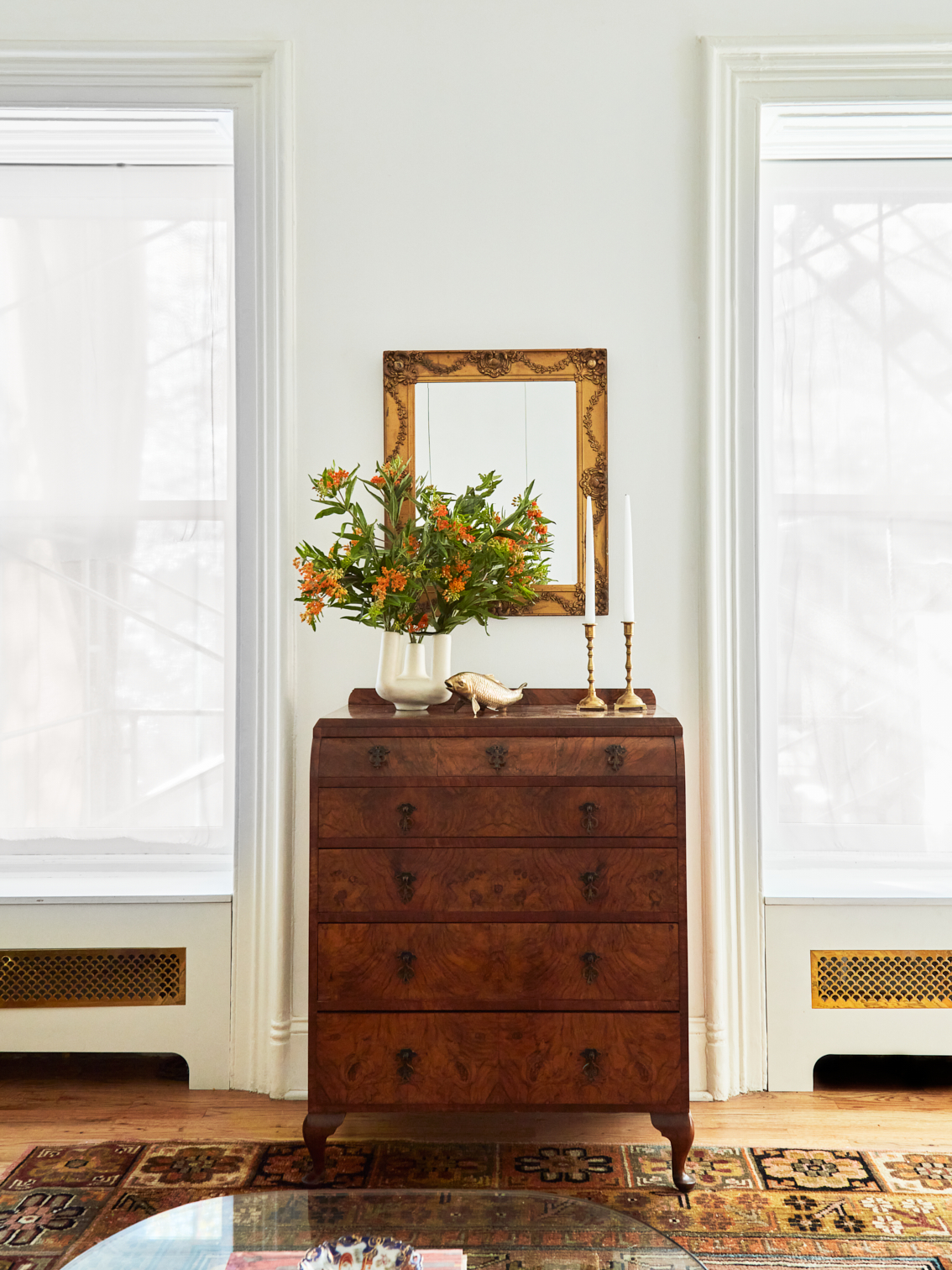 A handful of her more delicate bands, however, live in her bedroom’s extra-large jewelry box (the chest is actually a vintage lingerie cabinet) alongside earrings, necklaces, and bracelets, organized by color and material. “All my gold pieces are together, and the same with my pearls and my crystals, because I feel like I’m usually looking for the material first and then figuring out what size I want,” shares Behr. Items that are constantly on the go (bags, sunglasses, scarves, etc.) are located in either one of the two shallow closets situated in the entryway.