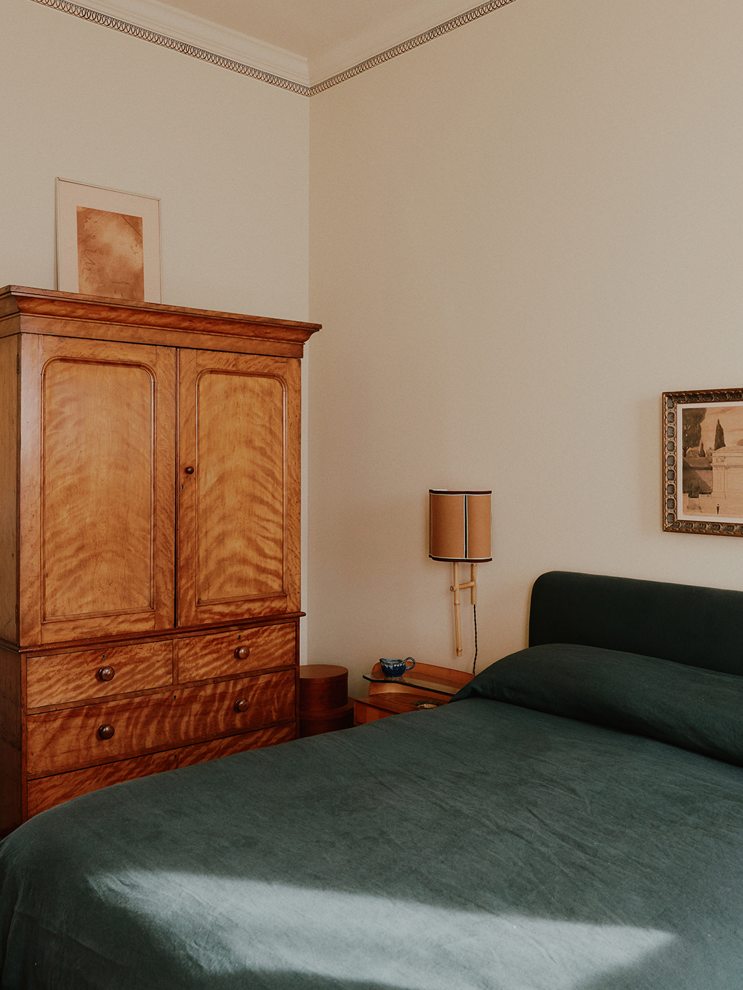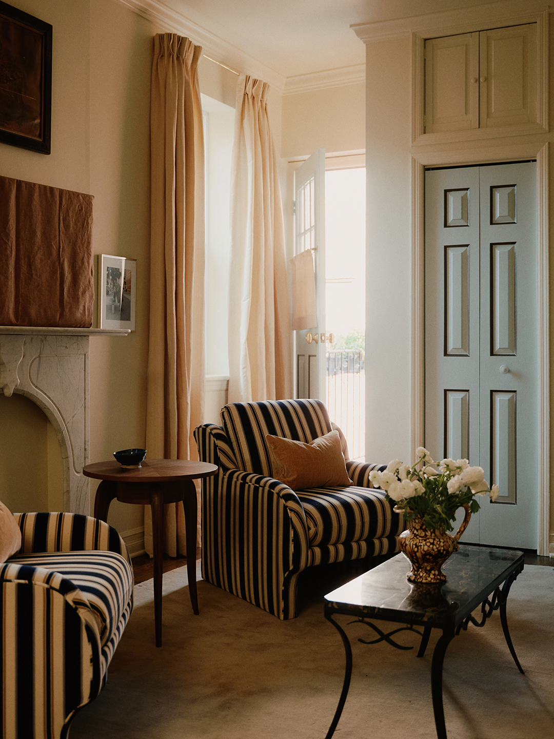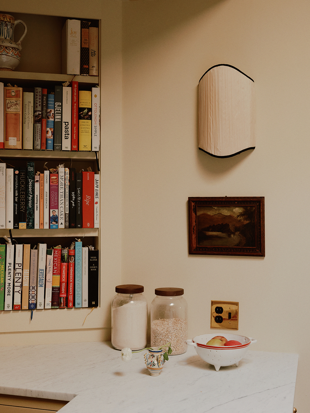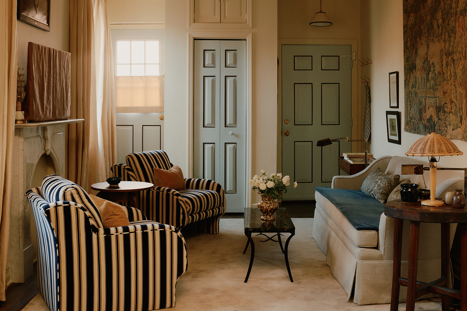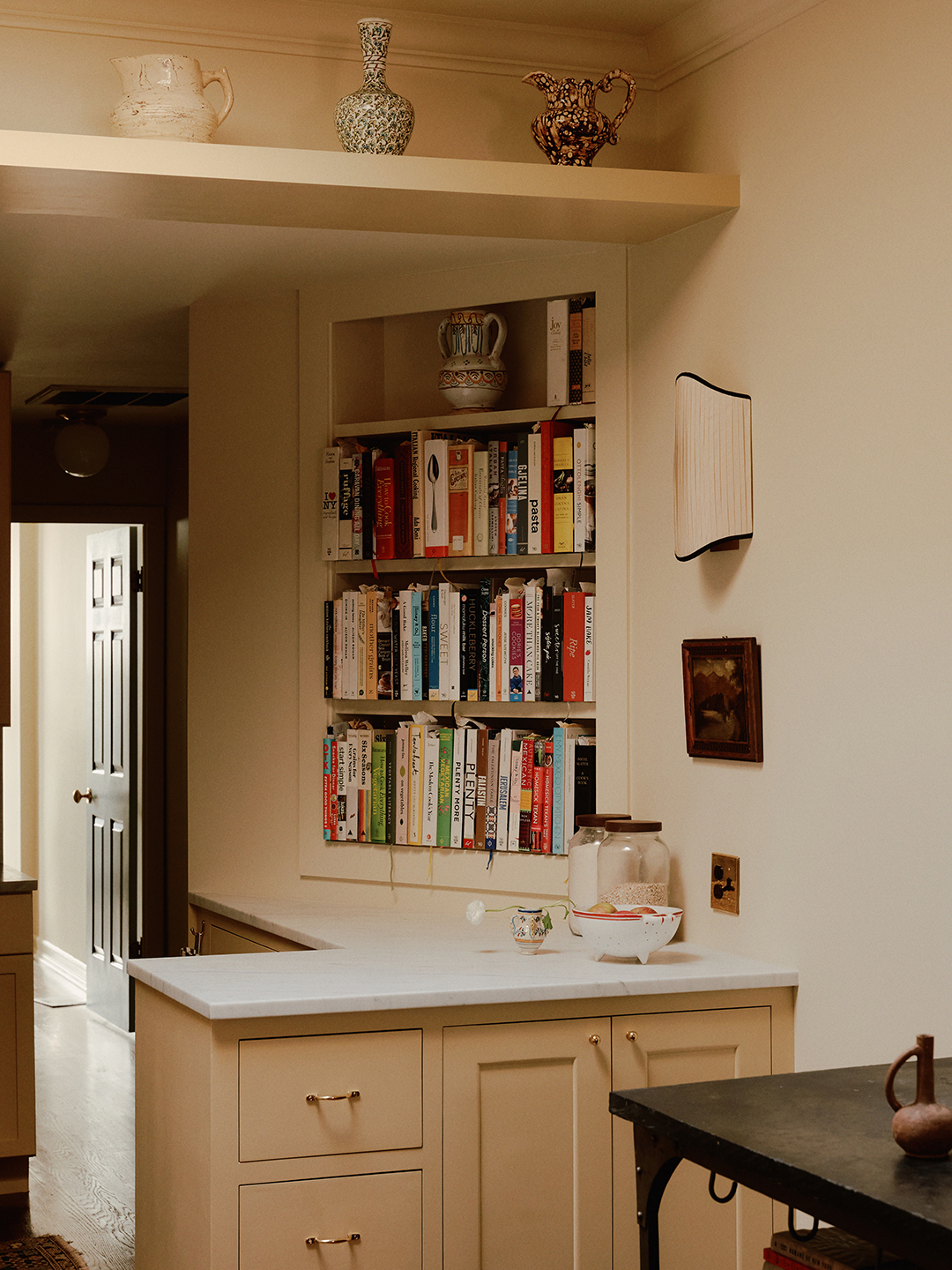 As if it’s just returned from a summer vacation on the Amalfi coast, the apartment now emits a warm glow. Hayley landed on Farrow & Ball’s Hay, a dusty yellow, for the kitchen cabinets and Benjamin Moore’s Elephant Tusk for all the walls. But when it came to the doors, her sister had a special request: She wanted them to be blue. Hayley presented the couple with two shades, and she wanted to use them both to trick the eye into thinking the panels are deeper than they really are. “I was trying to figure out a way to make the doors more appealing, and adding this trompe l’oeil detail gave them a more decorative look,” says the designer. Despite the painterly touch, the overall color palette for the apartment is definitively tight. “It’s a small space,” continues Hayley. “Cohesiveness is important, especially when you’re layering so much.”