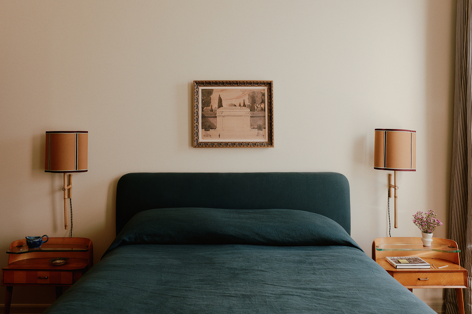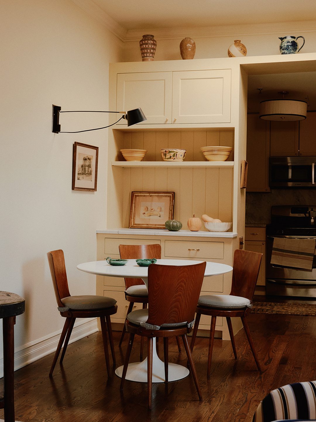 The splash of dark blue reappears on the bedding. For Tyler, keeping—or at least reimagining—the pieces of furniture they already owned was crucial. “He’s an avid composter and recycler, and he hates waste,” Hayley points out. The couple’s simple wood bed frame fell into the “let’s rethink this” bucket (the headboard is now wrapped in a custom slipcover), as did the dining chairs that now boast round cushions.