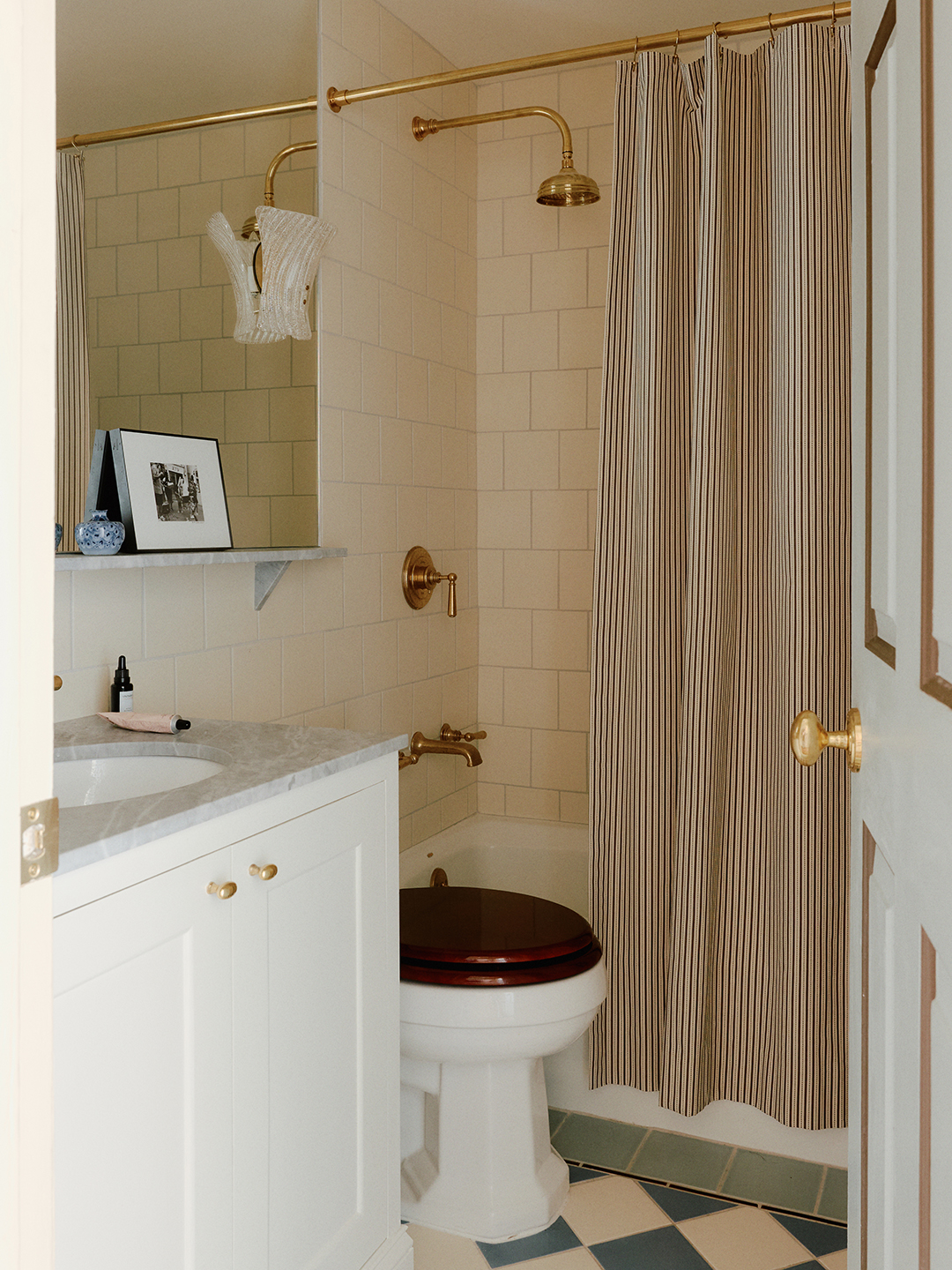 The tiny bathroom, which houses the washer and dryer, was also overdue for a makeover. First up: a vanity cabinet where they can store laundry detergent (before, they’d just plop it in the washer drum after use) and surplus toothpaste. “There would be a lot of things we’d buy again because we couldn’t see how much we had,” says Caitlin. Hayley made the room feel even bigger by shifting the inset medicine cabinet to the side wall and mounting an extra-large mirror. Even the electrical work came second to the mirror plan. The sconces are layered on top of the glass sheet. “I wanted a little jewel box, something you go into and feel like you’re in this beautiful place,” says Caitlin. One might say, Tuscany.
