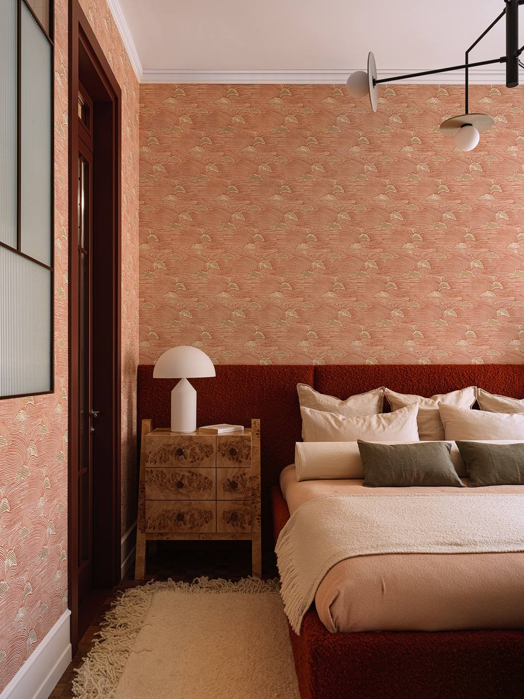 The first thing we bought was wallpaper for the primary bedroom—The Sunrise by Nobilis. The design features a muted red tone with subtle golden highlights. At first, the client worried it might look too pink or old-fashioned, but once installed, it lent the sleeping quarters a rich, sophisticated depth. The closet followed suit, with a coordinating green wallpaper from the same brand and a headboard fabric chosen to harmonize with the rest of the palette.