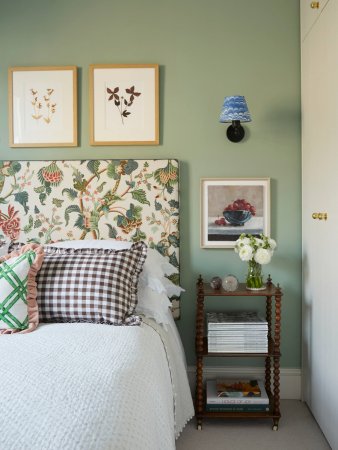 Although the outdoor space was tricky, the primary bedroom challenged her the most. “This was the hardest room for me,” Brown says. “I tried like 10 different headboards, and I have documentation for all of it.” First, she went with the one that matched the dresser, but it was too Art Deco. She tried several upholstered options, but none of the shapes hit quite right. Then there was a wood one she tried, only to discover it had been nibbled on by some type of pest, so that had to go. After adding more tone-on-tone prints to a single wall and a set of custom-color-matched light fixtures that trail up the surface on either side of the bed, it hit her. “There was never supposed to be a headboard here,” Brown says. “The wallpaper and the lights are the drama.”