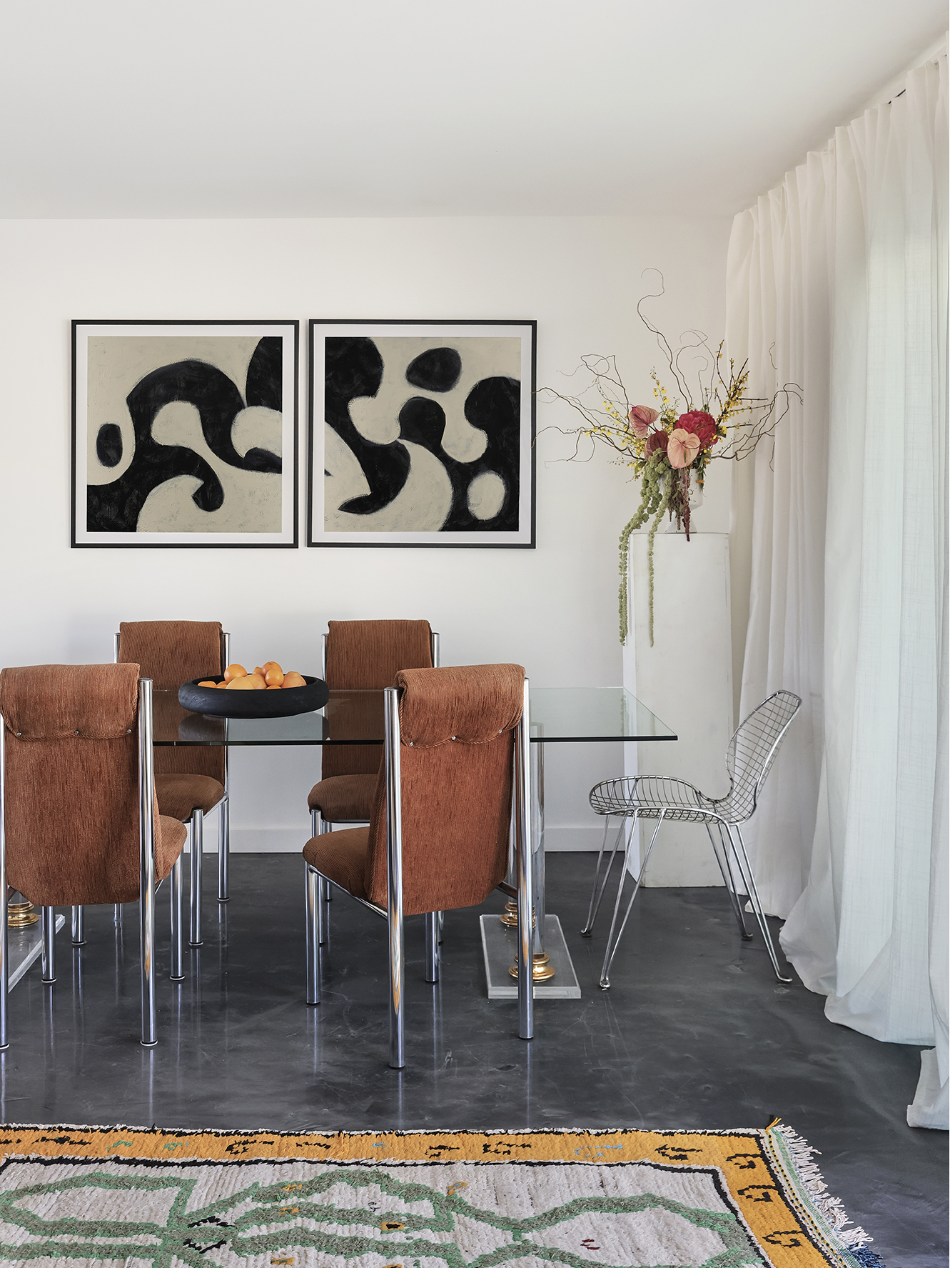 Opposite the nonaccent wall, Brown Frankenstein’d a dining table for eight from pieces she collected over the years. The Lucite and gold legs originally came with an oval top as a set she bought years ago that ended up being too small for her L.A. space. When she later found a table that had two wood pedestals as the legs and a large rectangular piece of glass listed for just $100, she said: “Immediately, yes.” Together, it was the perfect fit for the bungalow, and the two pedestals are back in her apartment holding up a couple of sculptures.