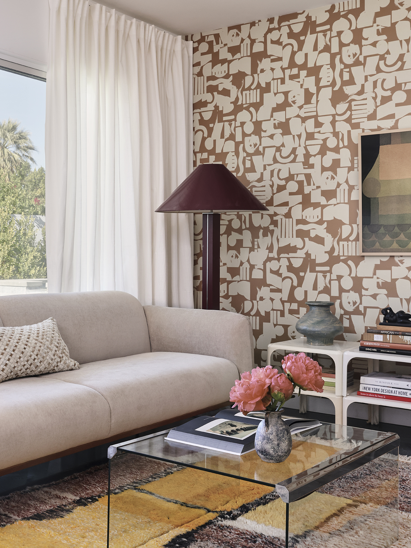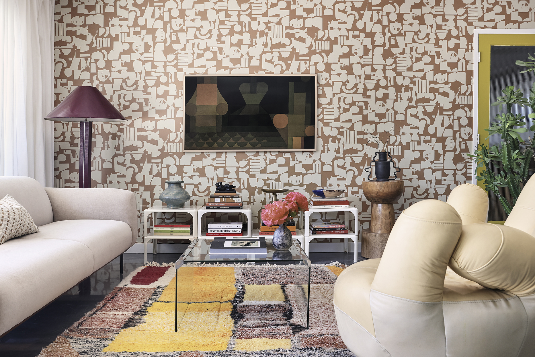 To the right, there’s a galley kitchen that previews a slice of the patterned wall leading into the next space. “I’m not an accent-wall girlie,” Brown says and continues to explain that because of how the house is situated, there’s only one real wall as it relates to the living room. If you’re sitting on the sofa, you’re facing the kitchen and your back is to the glass doors; the other wall makes up the dining room. For that reason, the Sarah Sherman Samuel covering is less of an accent and more of a way to delineate the space. As for the choice of print—it’s a wink to her taste in fashion. “The way I dress is eclectic, and I like to mix patterns,” she says. “And I love a nice, allover neutral print because it plays well with so many things.”