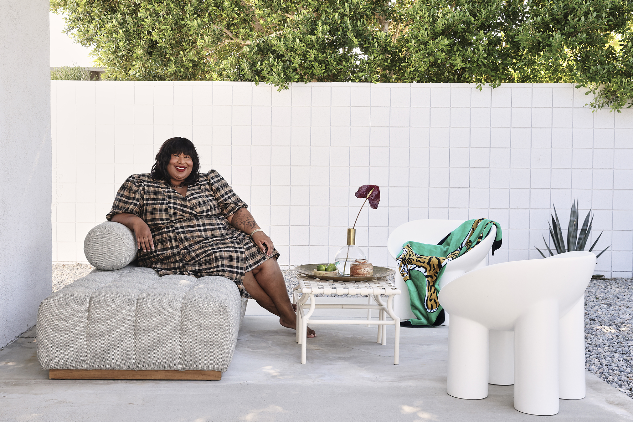 Even though the inside of the home was a no demo-reno, outside, she made more significant changes with landscaping and furniture. Beyond the sliding glass doors, a barrier of cold, whitewashed cinder blocks enclosed the yard until she warmed things up with a row of ficus trees. The firepit was also already there, but Brown gave it some personality by surrounding it with Roly Poly chairs. “Being a New Yorker, I had never designed anything outside beyond a small patio, so this was a really fun exercise,” she says. The existing pergola was a little too small, so she swapped it for a Wayfair find paired with a more comfortable outdoor dining set. “In a place like Palm Springs, dining alfresco is the number-one thing you want,” she says. “I’m a plus-size person, and outdoor furniture can be tough. I wanted every single thing in my home to feel incredibly accessible, no matter what your body is like.” Not only did the teakwood set add warmth to the space, but the heavy seating with built-in cushions makes everyone comfy in this corner of the yard.