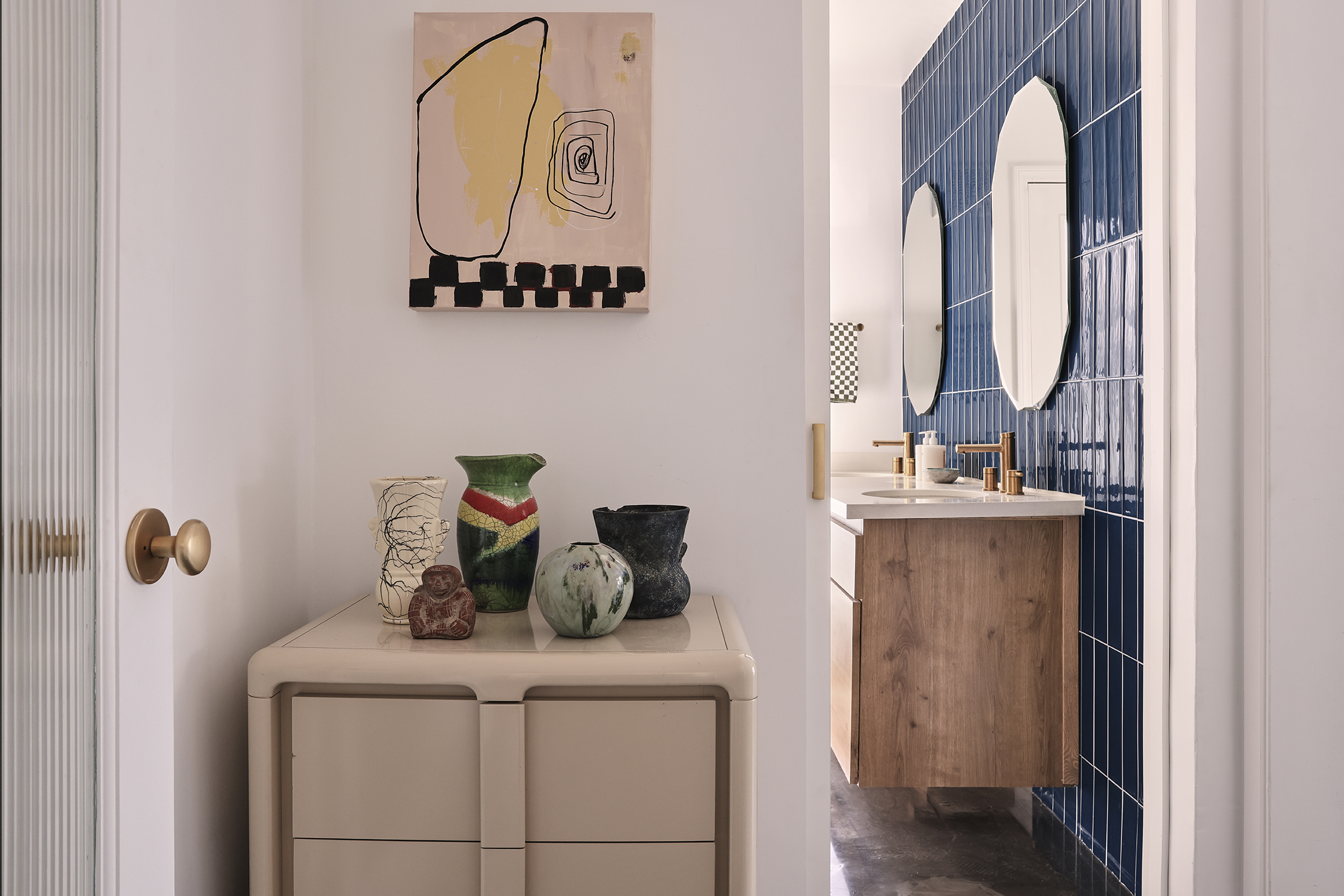 There were a few things from the storage haul she would use as placeholders, but she knew the yellow leather glove chair was going to stay. (“Everyone loves to sit there because it’s literally hugging you,” Brown says.) Her style leans postmodern and primal (peep the mix of playful silhouettes and organic shapes throughout), but do you even live in Palm Springs without some nod to the ’50s or ’60s in your home? A vintage pine credenza fills the mid-century modern role to the left of the entrance without being too on the nose. “It’s just one of those pieces that I’m so glad didn’t end up in a landfill,” she adds. Instead it’s filled with extra blankets, board games, and toolbox essentials like a hammer and spare Command Strips.