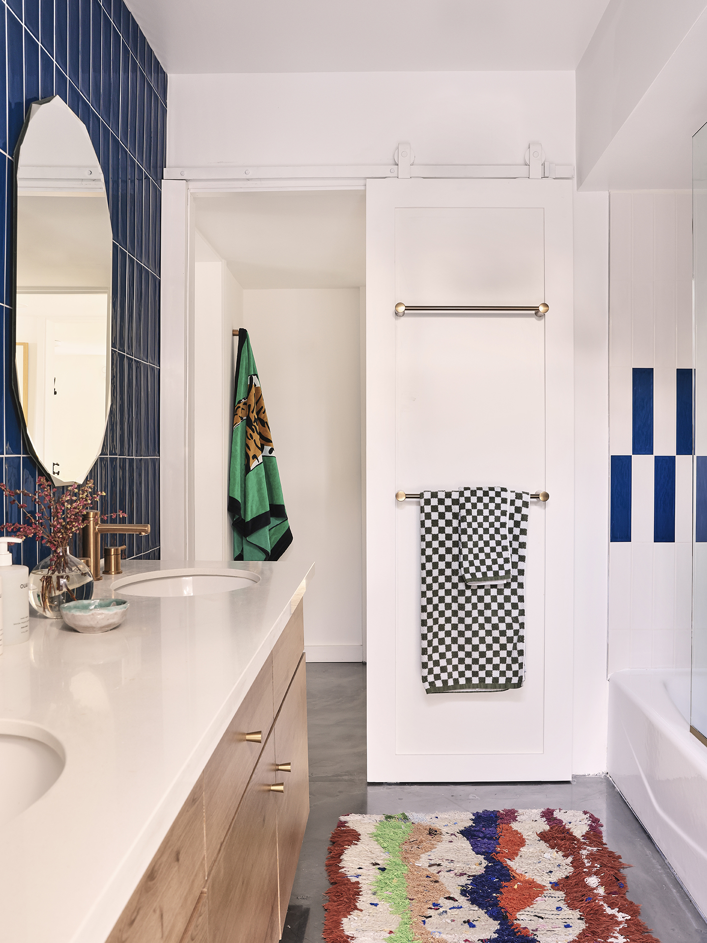 The only room that got a light reno touch was the primary en suite. “There wasn’t a door to the actual bathroom, so you’re just exposed to the elements,” Brown says with a laugh. “I don’t know who uses the bathroom just wild like that.” So she called in a woodworker friend to build an enclosure that would suit the space. There wasn’t room for it to swing out, so they took the towel racks off the wall and put them onto a sliding door to add some privacy without sacrificing storage.