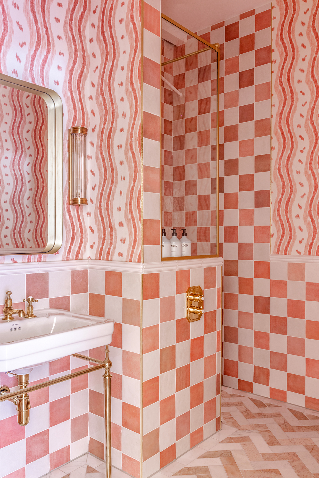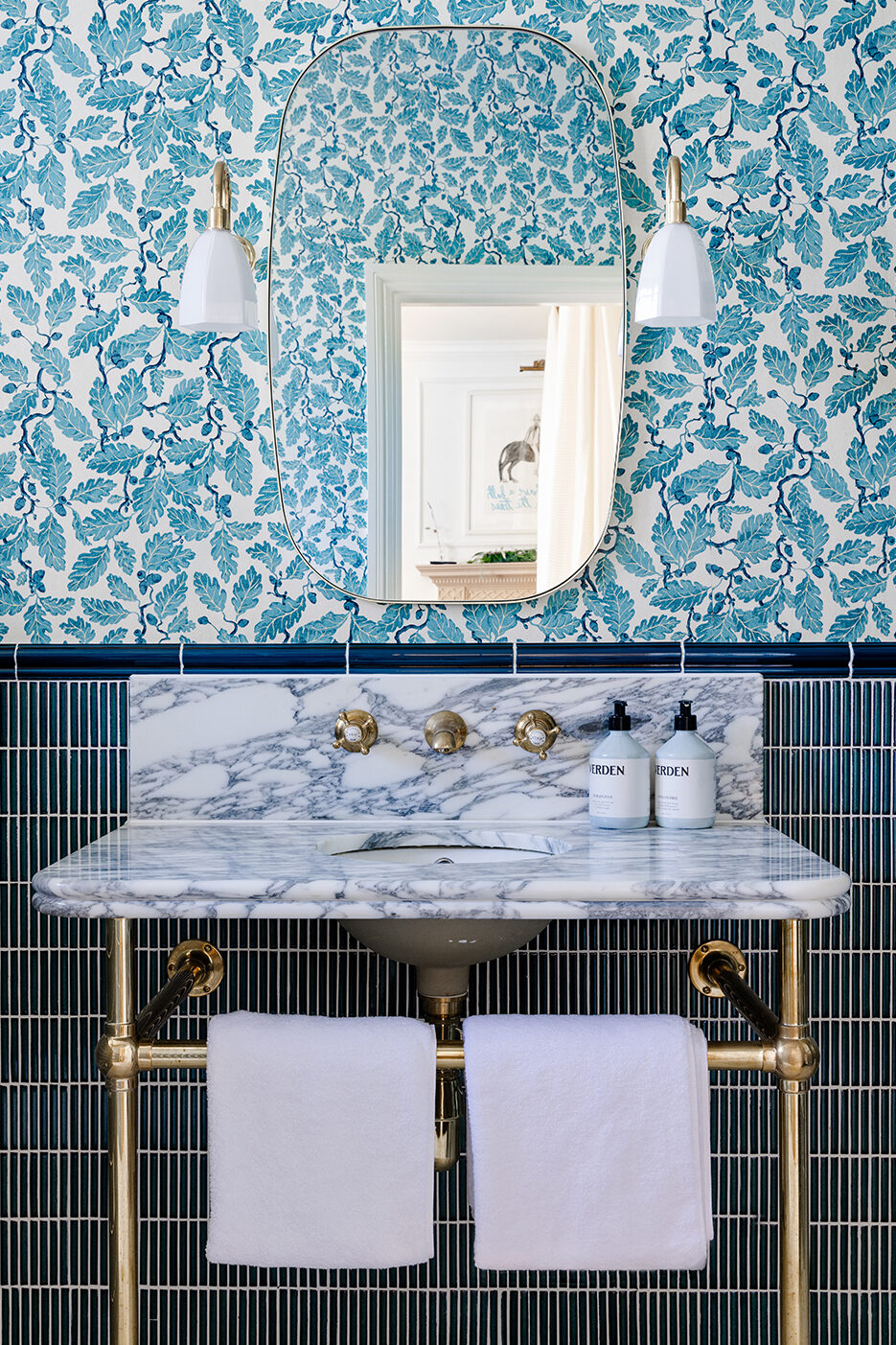 While you’d expect a bathroom with two different types of tile and walls swathed in wallpaper would make your head spin, it can actually be quite harmonious when executed the right way. “The matching color combinations are actually quite calming and easy to digest,” says Sear-Barlow. Once she had settled on the wall treatment, finding the tile to go with was a relatively easy task. “That was a real ‘bingo!’ moment when we’d find a match,” she recalls.