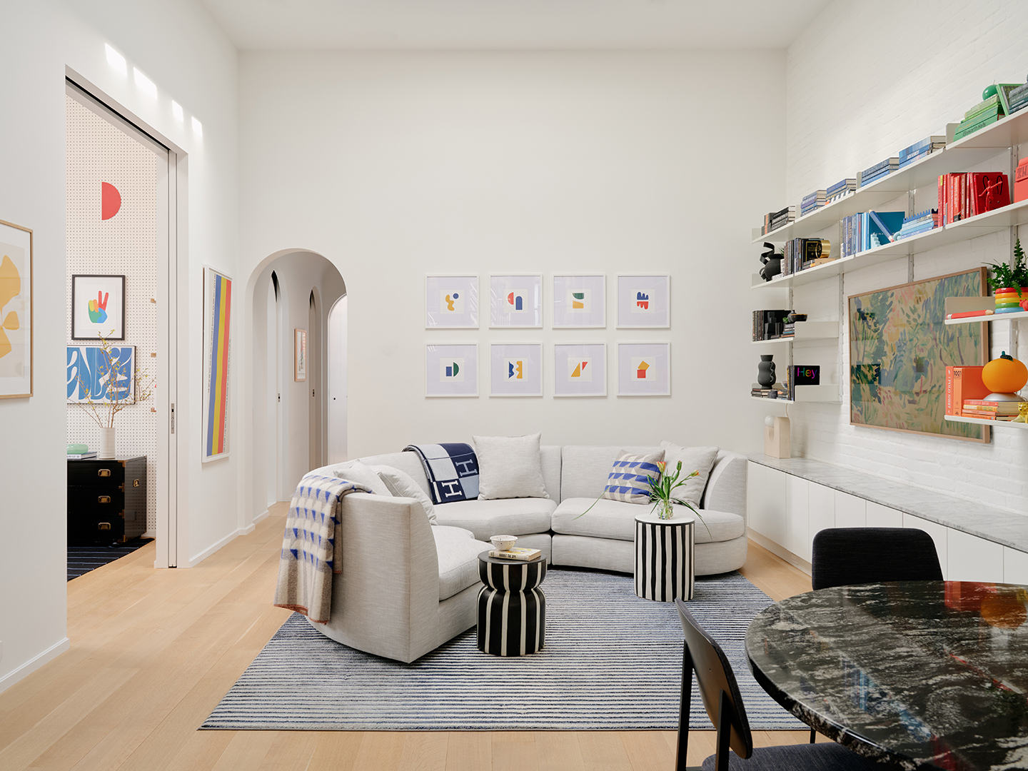While the design team maintained the apartment’s airy loft feel in the public living areas, they marked the transition into the private spaces with low, arched thresholds and curved pocket doors, creating a tunnel-like effect. The one exception is the Shanahans’ younger son Reed’s nursery, which is located in a large flex room off the living area and filled with Babar-themed art from Chairish and vintage wood toys inspired by the books. “Reed never plays with any of it, but it makes me happy to see them when I’m in his room at 2 a.m. wondering why he never sleeps,” Devin says.