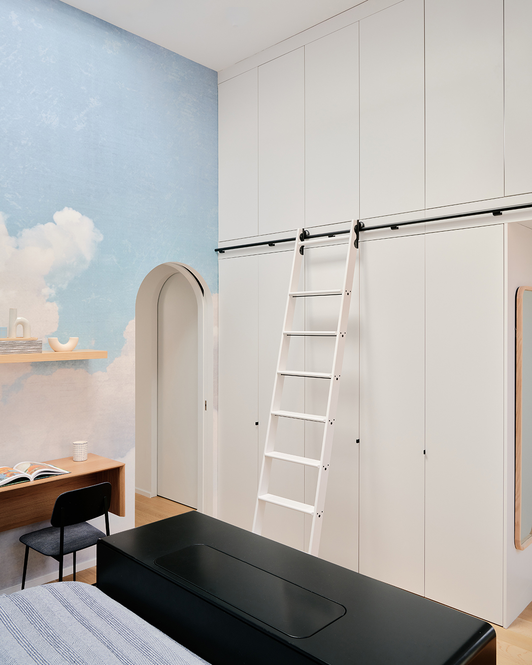 Carrying punchy colors throughout the rest of the apartment was as much of a practical decision as it was a style-driven one. “I appreciate a nice, neutral palette with the beiges and creams, but the minimalist decor and earthy aesthetic falls apart quickly if your kid leaves their orange dump truck out,” explains Devin. Fortunately, there are plenty of hidden storage spots where they can stow toys and craft projects when guests come over. The primary bedroom boasts a double-height, semi-custom closet system (the frames are IKEA Pax). The rolling Beauty and the Beast–esque ladder offers easy access to a roomy upper cubby that holds Devin’s creative projects and off-season accessories. “It’s also where I hide from my children,” she jokes.