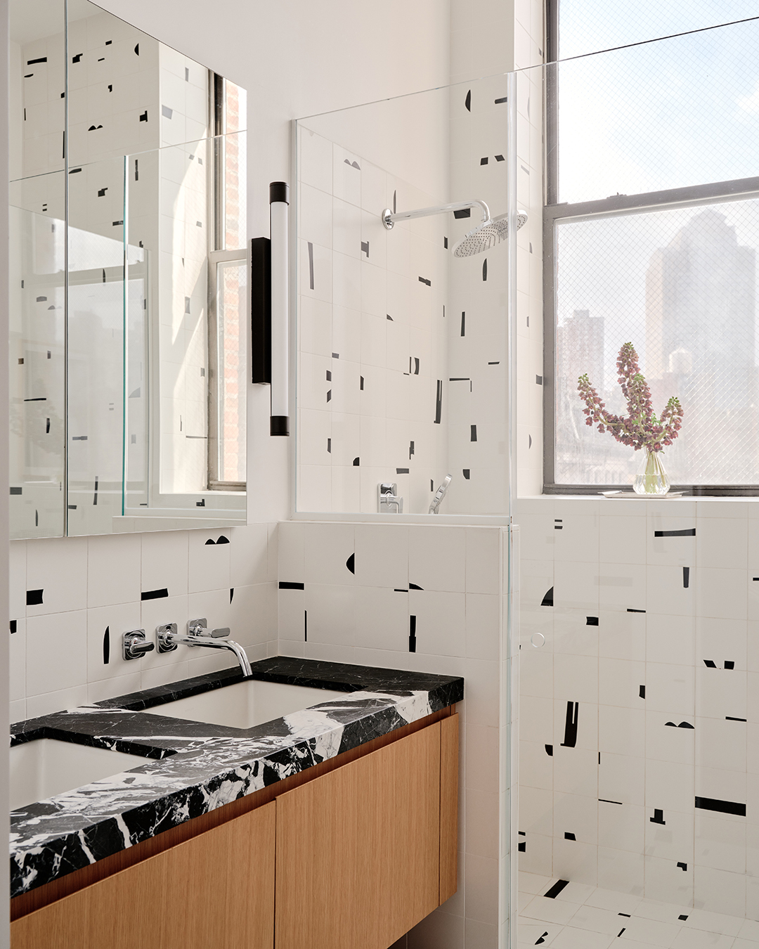 Most of the time, at least in the early hours of the morning, you’ll find all four of them together in bed watching a show on the television that pops up from the black credenza by KLN Studio. “Any screen-time rules we try to enforce do not count before 7 a.m.,” Devin points out. “We owe our sanity to this TV.” They also credit it to the ceramic tile–covered bathrooms: The nonporous epoxy grout doesn’t show any discoloration or dirt from child- or dog-induced accidents. While the pieces look randomly arranged, Devin painstakingly laid out each one for the subcontractor using a sophisticated letter-slash-numbering system. “I had fun with it, but I am not sure [he] ever wants to see me again,” she says, laughing.