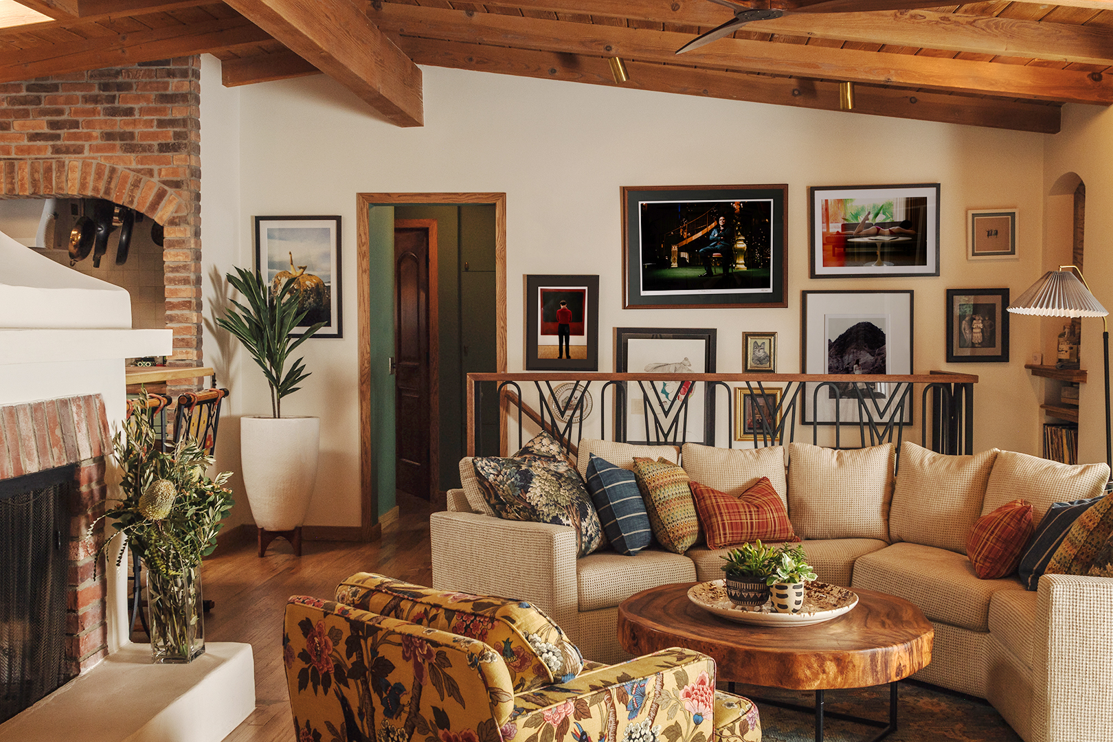To achieve that sought-after old-world feel, they added vintage knobs and pulls on the doors and cabinetry, live-edge wood vanities to the bathroom, cane doors to the built-ins, and woven rush detailing to the island. Even the balustrade was a custom addition inspired by the 1930s. Likewise, the kitchen looks as though it could have enjoyed a past life on a silent-movie set. “Remarkably, everything in there is new,” says Gaglione, who overhauled the space with sage cabinetry and rustic brick tile around the range. “Each one is field-cut and specially treated to feel worn and imperfect.” The vinyl window trims and baseboards throughout the home were also updated with white oak, while the club chairs in the living room—originally Edwards’s grandfather’s—were reupholstered with a tropical bird print that nods to L.A.’s year-round sunshine.
