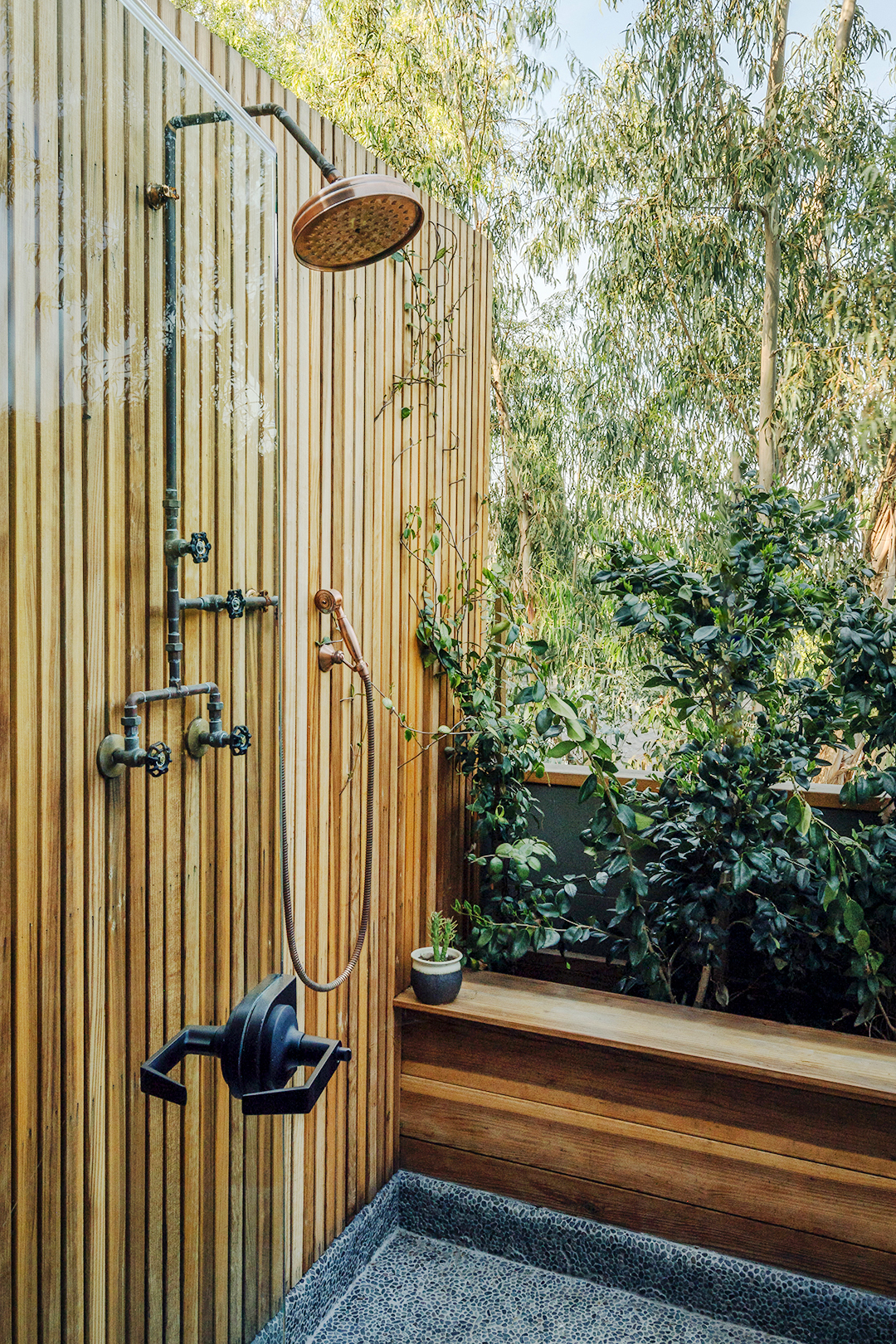 Most evenings, when time permits, Edwards likes to relax with a warm bath. “It’s my favorite place to be, in the tub with the moon for a neighbor,” she says of the petite primary bathroom that previously accommodated just a shower cubicle and single vanity unit. “We did a little magic with the space planning here, thanks, in large part, to the inclusion of the window,” says Gaglione, who somehow managed to squeeze a double vanity and a freestanding tub into the impossibly tiny space. But of course, the real crown jewel, he insists, is the outdoor shower. “There isn’t much cover above waist height, so your top half is always visible,” he points out. “‘Hey…Laurel Canyon living!’ is what Caroline said, and I can’t argue with that.”