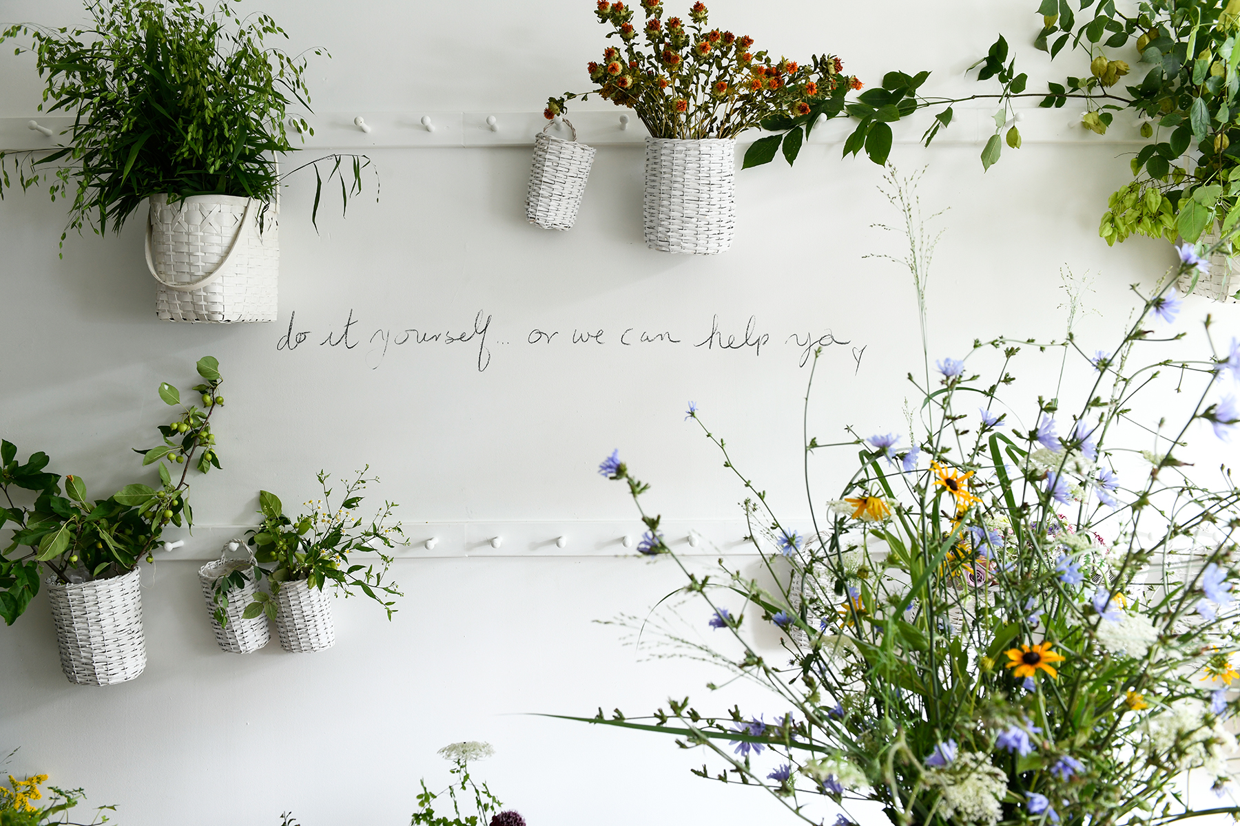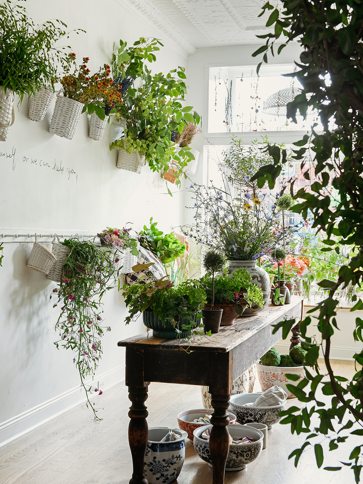 Dried flowers hang from the ceiling and in the window, but there’s one wall detail that we’d like to steal for our own homes: Ford’s clever peg rail display, which holds baskets of “pick your own” flowers in the shop, but we think would also be a great entryway idea.
