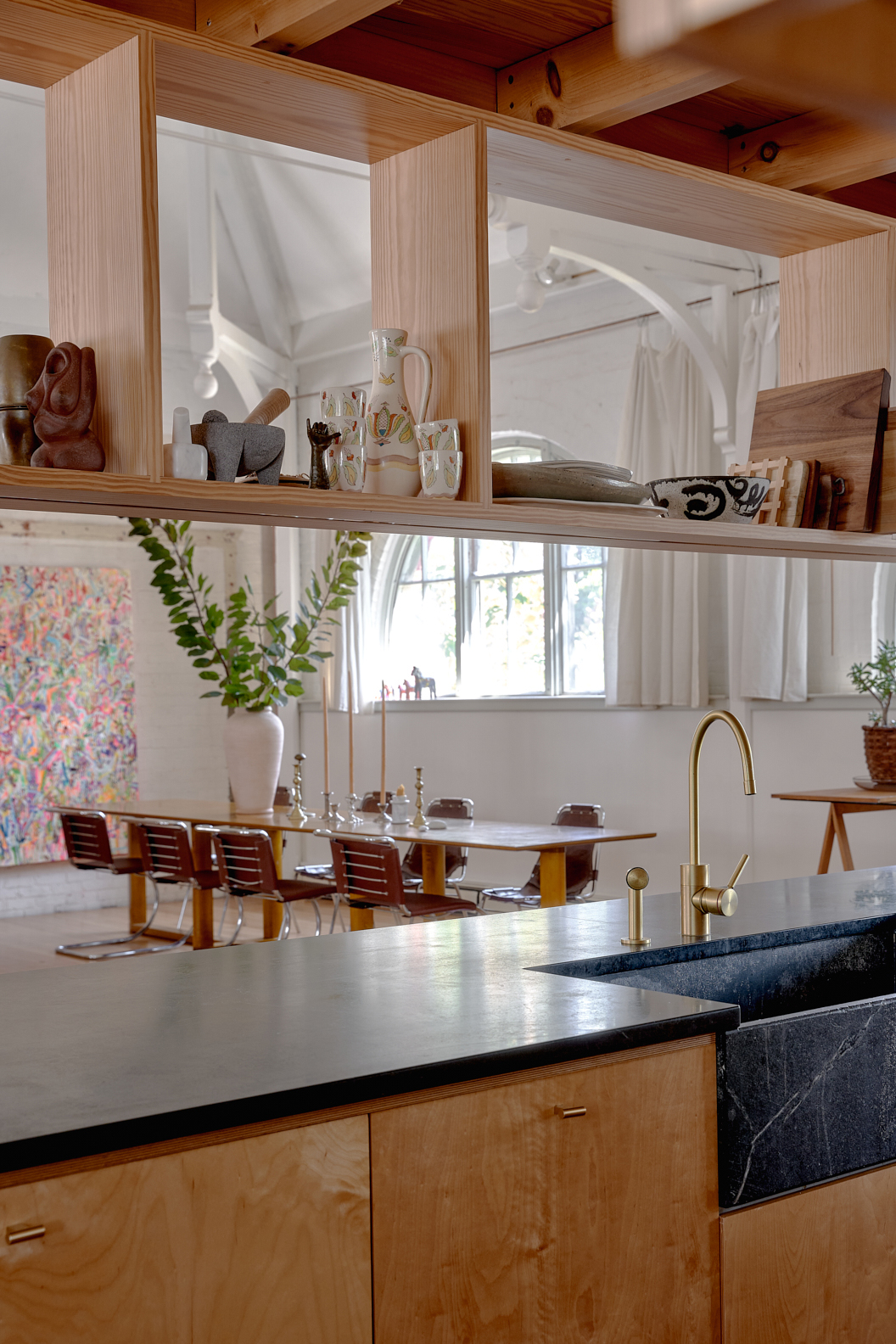 “It echoes a religious space, but it was always a municipal building,” McDonough says of the William R. Walker & Son-designed structure, dubbed the Fifth Ward Wardroom (it’s been on the National Register of Historic Places since the ’80s). For all of its current charm, the couple didn’t inherit it in this state. The most recent owner before them had used it as a printmaking studio, but McDonough and MacKean weren’t going to activate their own artistic practices in the expansive, airy space; they were going to live there.