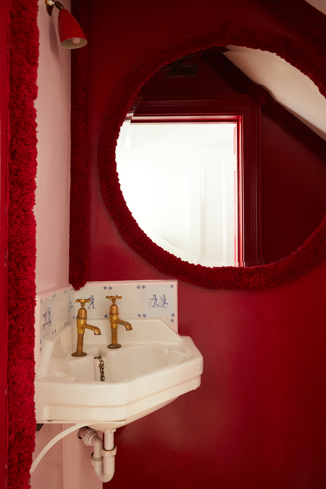 The tiny powder room under the stairs (a mainstay in London homes) is a testament to Angus’s DIY skills and his previous career working in set design. After the space was painted pink and red (one of their favorite color combinations), he hot-glued fuzzy red trim onto the wall and mirror. “We had a sample lying around at home, and before you knew it, it was everywhere,” Charlotte says with a laugh. Putting more scraps to use, they framed the tiny sink with Delft tile left over from the ones they sourced to line the living room threshold.