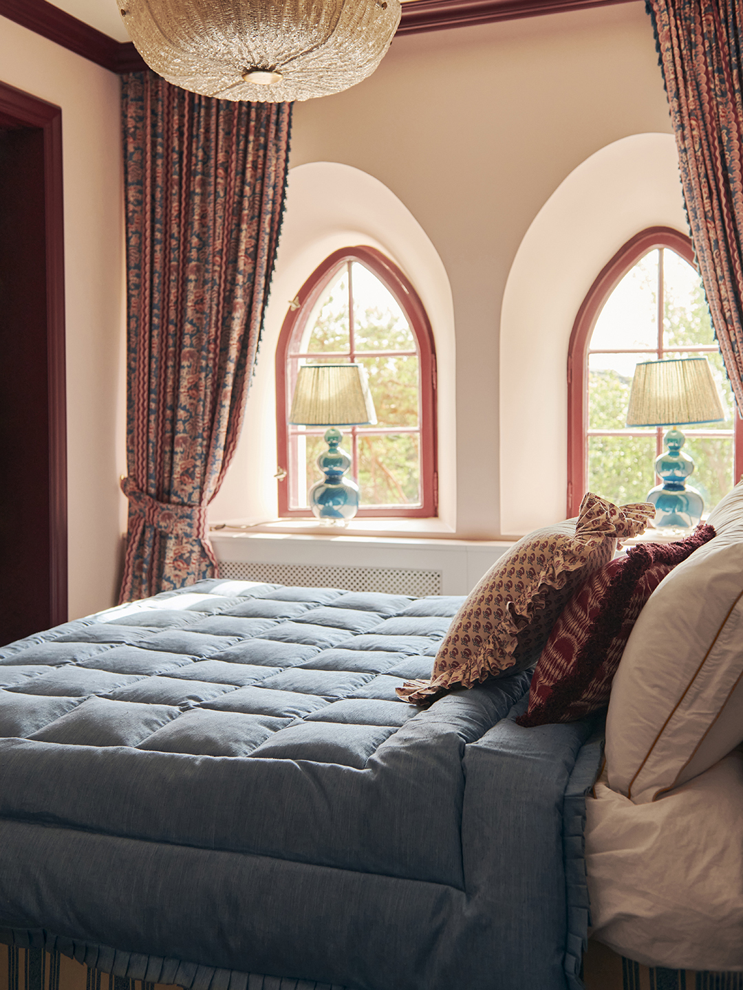 My middle child is super social, but she has type 1 diabetes type which makes it tricky for her to stay over at her friends’ houses. My challenge was organizing her space to make it easier for her to have sleepovers. A bunk bed was practical and the curtains highlight the ceiling and make the room look a bit bigger. | Paint Color on Beds, Blue Gray by Farrow & Ball; Curtain Fabric, Jane Churchill; Bed Fabric, Fermoie.My eldest is really interested in decorating and she was actually the one that figured out the layout for her room. She made the color scheme and we picked out fabrics together. The walls are a paint mix I created myself based on Farrow & Ball’s Calamine except I added more white and yellow to it so it has less of a blue tint. The bathroom had a lot of ’90s details (chrome, blue light coming from the towel dryers). I wanted to keep the renovation on budget so I changed the toilets, had the cabinets painted green to tie it together with the kitchen, and changed the hardware to brass. | Vanity Paint Color, Lichen by Farrow & Ball.We are on the first two levels and have access to a big garden outside, so it feels like we’re in a house, even though it’s an apartment in a water tower. The feeling is so relaxed that sometimes we’ll be in our PJs having breakfast outside and we remember, ‘Oh my gosh, we have neighbors!’