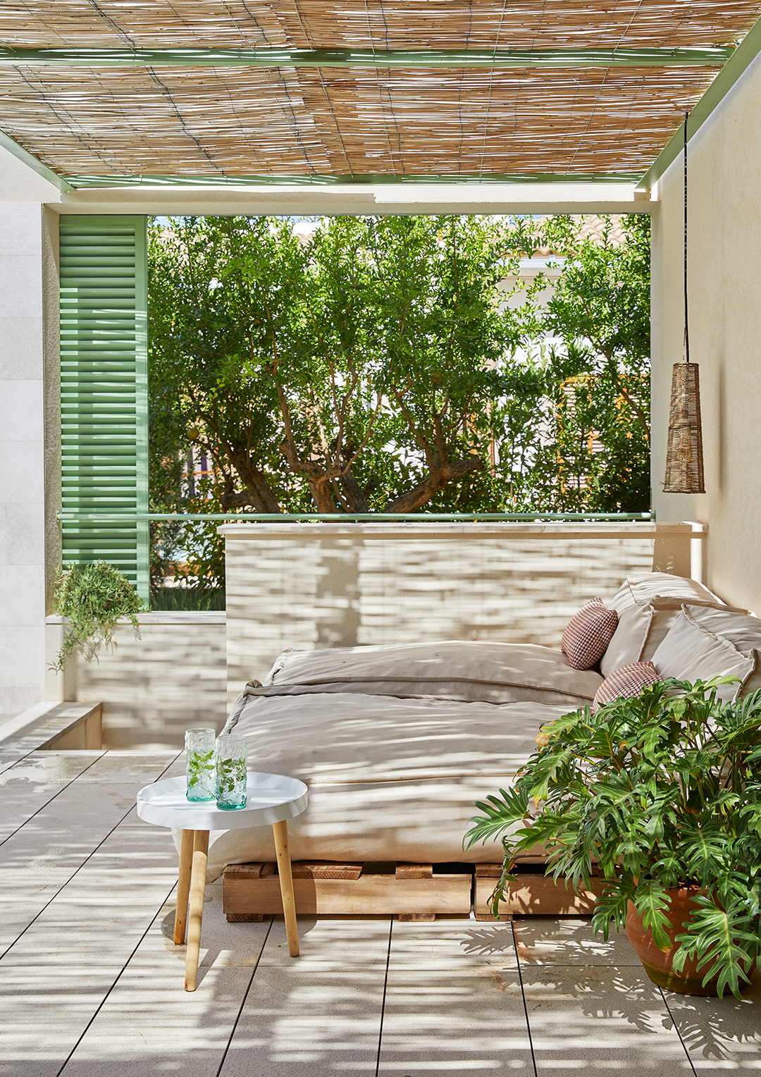 Mulet: The pergola is made from cane, which is traditional here, but also it produces a shadow while also letting heat escape. If you had a concrete floor or roof, the heat can’t go out. | Side Table, Amazon.
