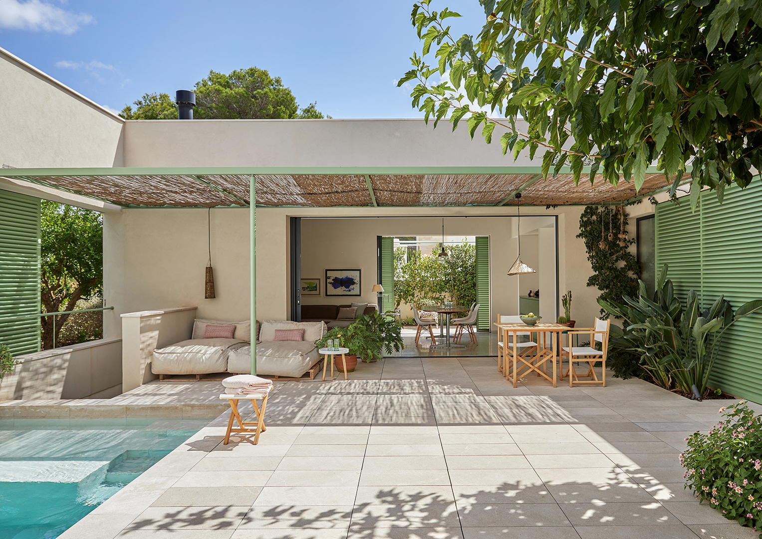 So in 2020, the pair—Mulet is an architect and Trautmann, a creative and design consultant—bought a plot on the northern part of the island where Mulet used to vacation as a kid. Ten months later, they had built a three bedroom, two bathroom patio house that is only around 1,000 square feet, but thanks to the sprawling outdoor space, it feels double the size, especially because they get to use the breezy open-air lounge year-round.