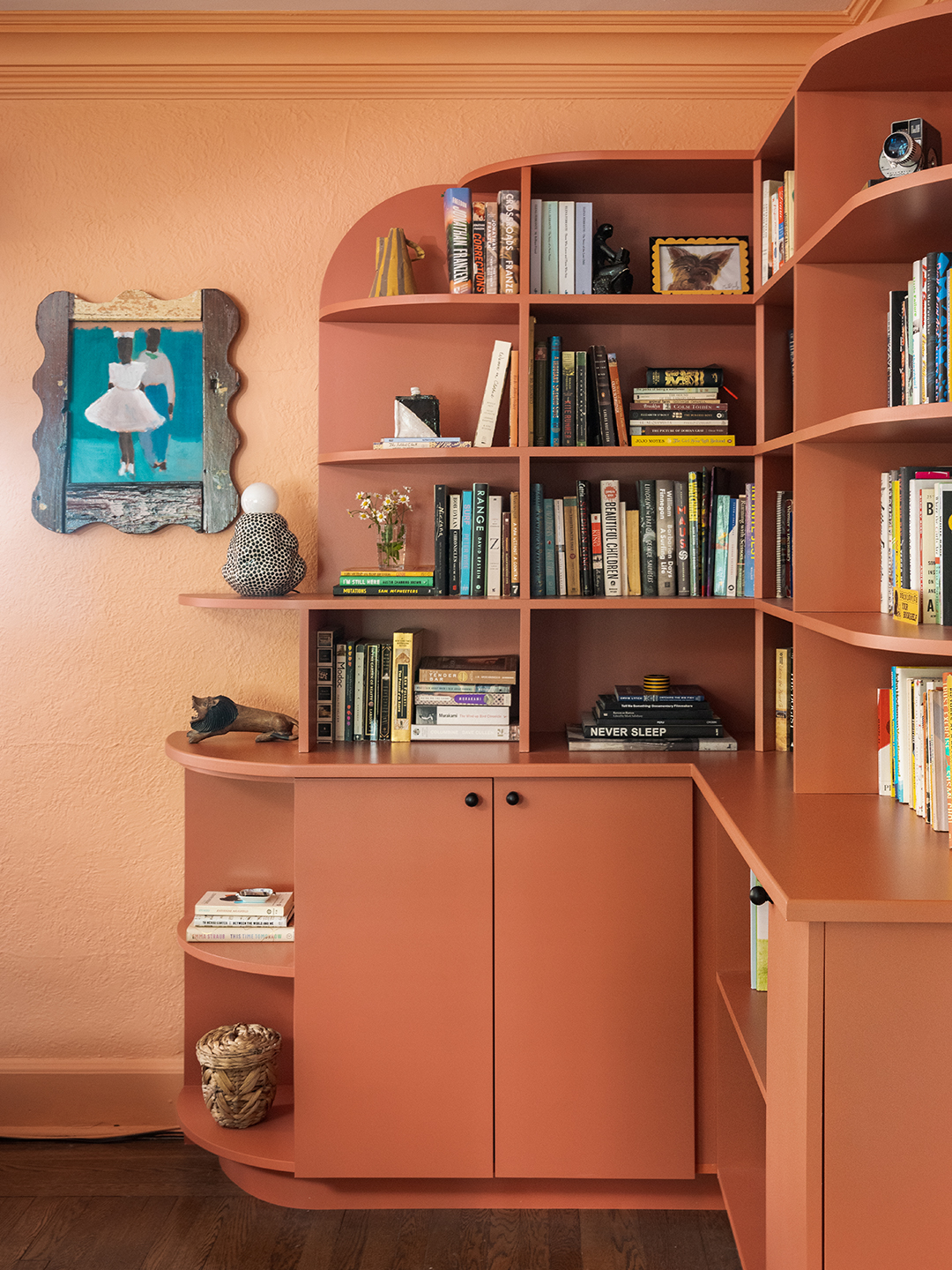 A joint desire for vibrancy—and to highlight the existing curves of the home—served as Velten-Lattrell’s creative anchor. “I saw the house in a circular movement. I thought a lot about sunscape palettes and solar rhythm…sunrise in the kitchen and bedroom, sunset in the living room, and night garden in the dining room, mimicking the day’s cycle,” she explains. Velten-Lattrell had her carpentry team craft custom built-ins with a similarly sinuous feel, inspired by a vintage piece with an Art Deco–meets-’80s vibe. All were finished with machine-sprayed paint for durability and minimalist hardware for a clean contrast to the oversize bends and waves.
