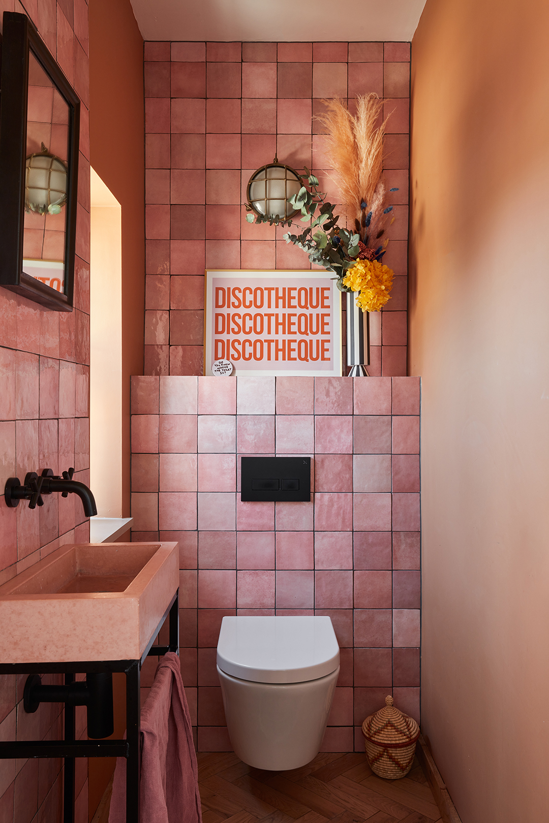 One room that always garners excitement from visitors is the narrow powder room, which is clad in pink zellige tile and has a coordinating concrete sink and saffron-tinged walls. “I used the tiles to accentuate how long and thin that space is,” explains Hannah. The warm tones are echoed around the house, courtesy of a palette of orange, pink, and beige, contrasted with pops of green as a nod to the sea, which is just a short walk away.