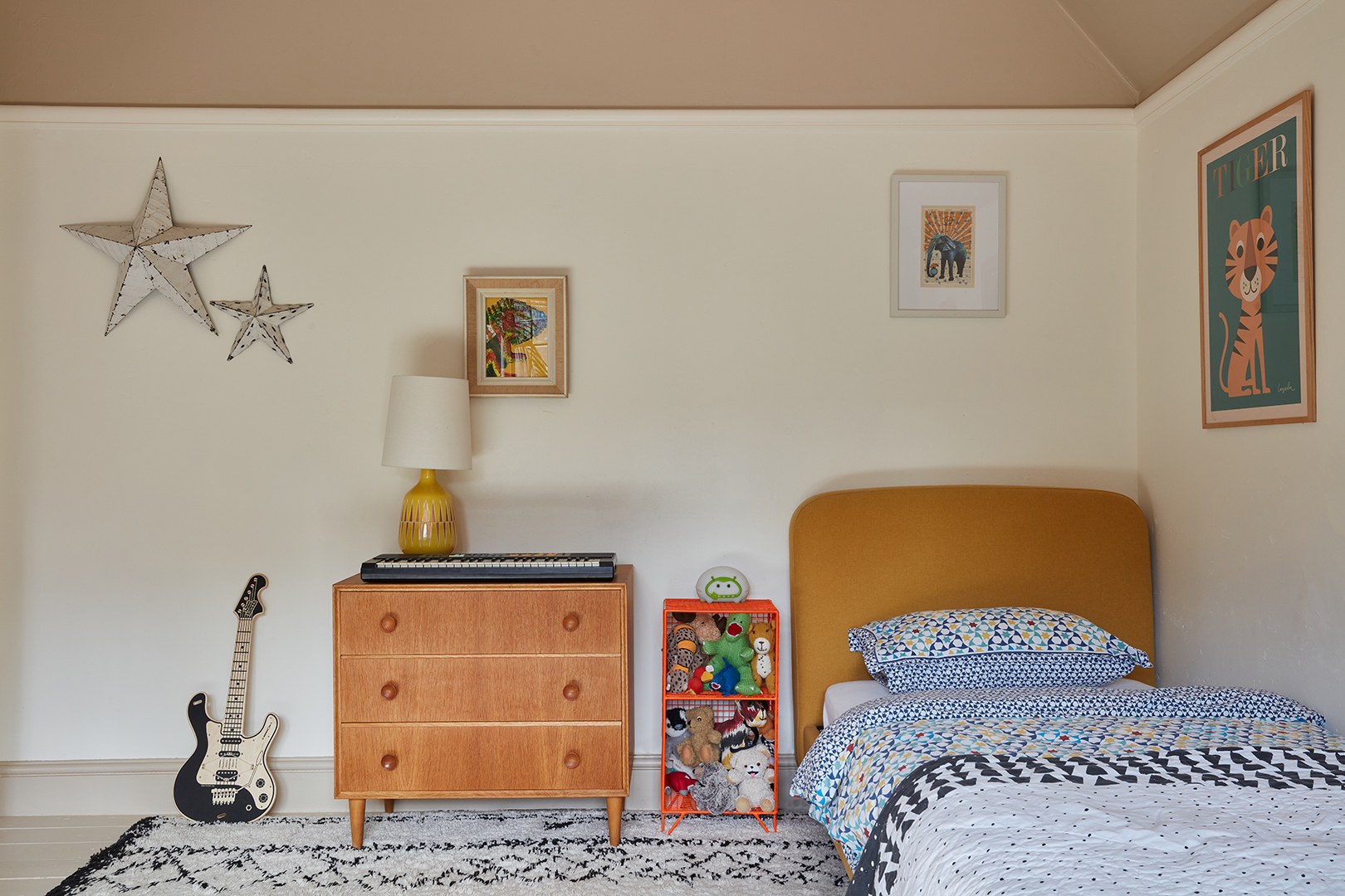 In Felix’s space, the ceiling is wrapped in a warming, sandy-toned paint—a nod to the subtle shipwreck theme the designer was going for (not pictured: a life-size resin cactus and palm tree in the corner). “It started when my mum, who is an antiques dealer, bought me a model of a ship,” explains Hannah. “I wanted it to reflect that we live by the beach without the stereotypical nautical stuff.”