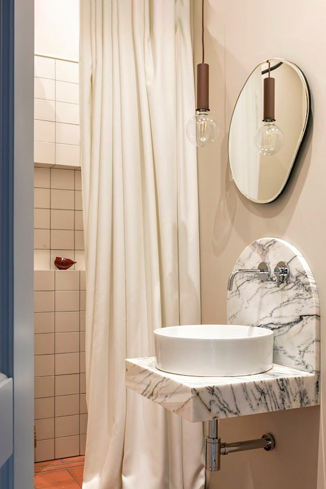 “It kind of feels like I have two apartments—one that’s private to me and the other where I entertain and work,” she notes. The rejiggering of the floor plan also involved absorbing the once-outdoor balcony into the interior (by adding insulation and glass) and turning it into a bay window of sorts. When Obez wants to cloud gaze in private, she can simply draw the blush curtains that double as a room divider.