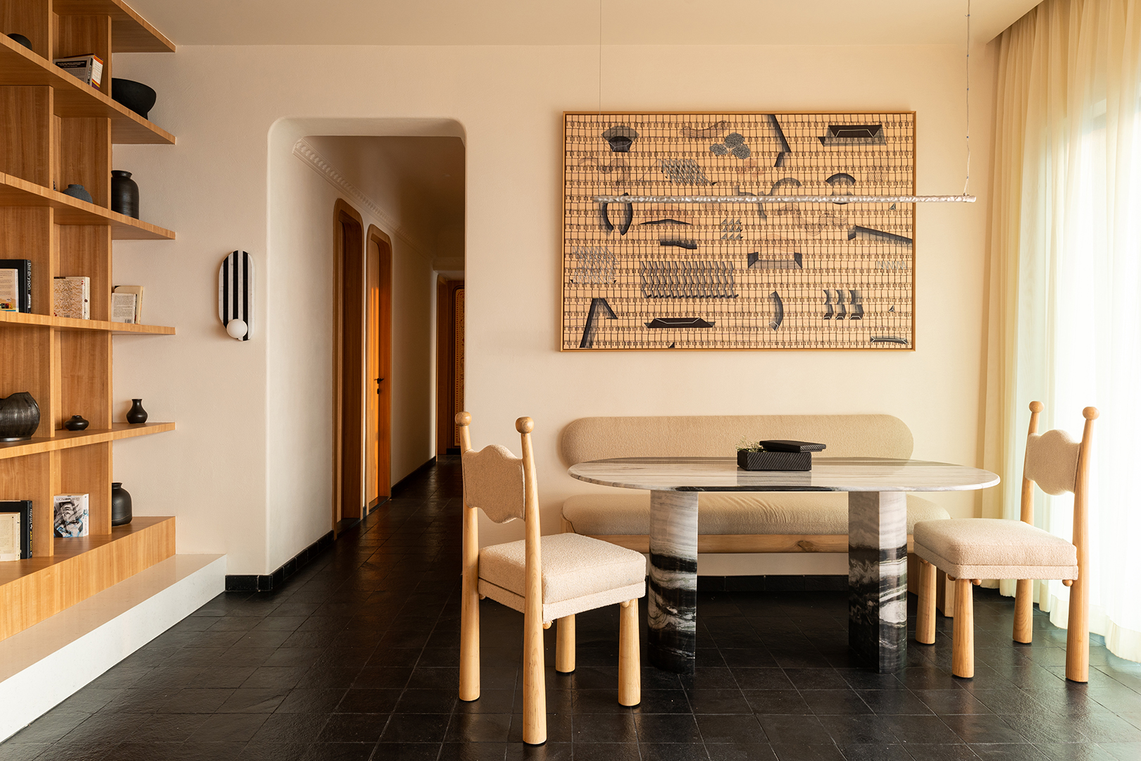 Warm white walls and breezy sheer curtains elevate the space’s glow. After sampling numerous materials, Studio GaGa settled on a gently treated black riverstone tile for the floors. Although unconventional, it provides a soothing, cool feel underfoot—a perfect antidote for Mumbai’s hot, sticky weather. Solid oak-wood bookshelves, wardrobes, and doors complement the flooring, creating that “warm, earthy, and cocooning” vibe the couple envisioned from the get-go.