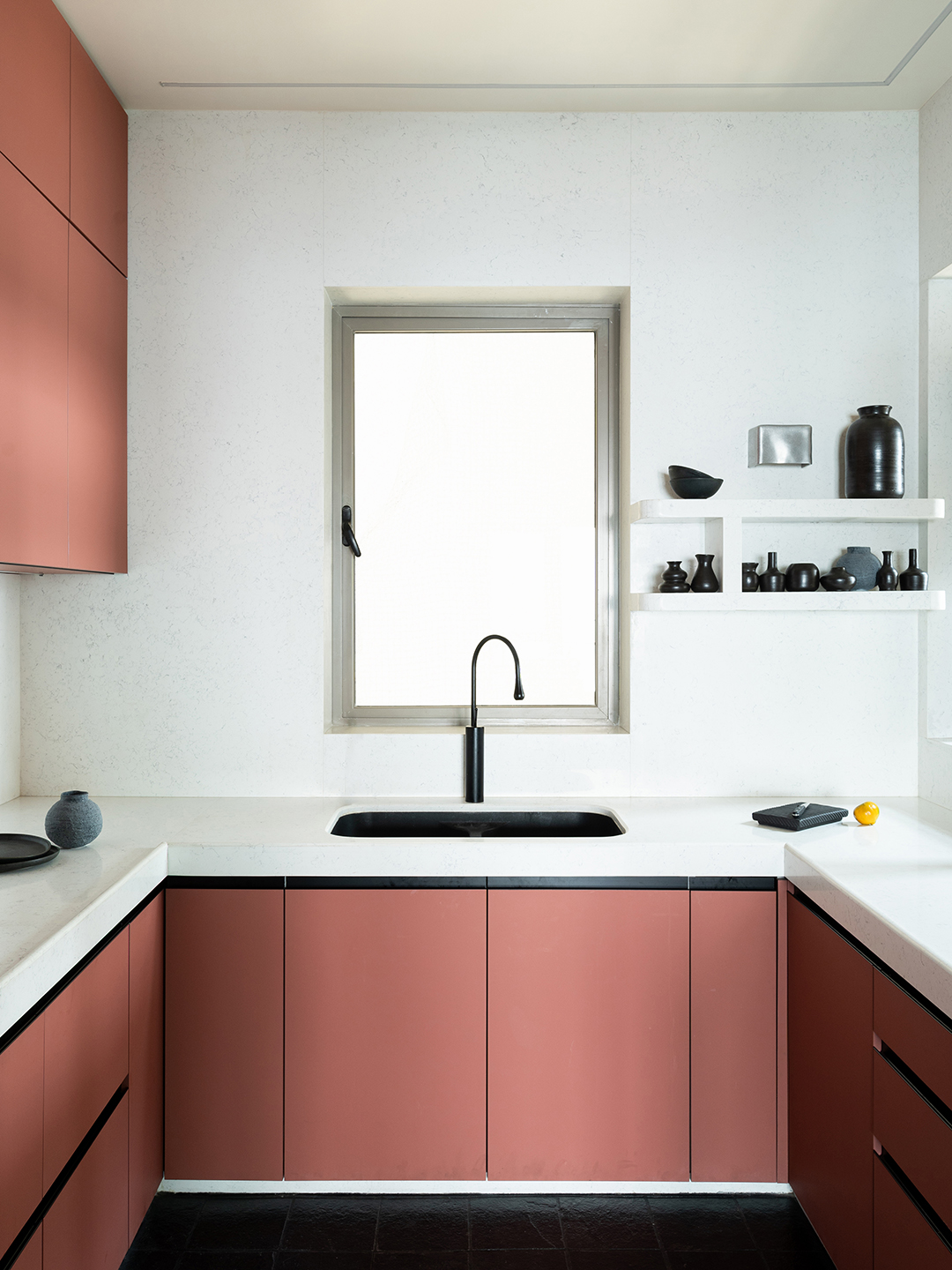 The hue saturates the living room with a plush daybed and handwoven rug that pulls double duty on the wall as art. Soft edges, curved furniture, and lush plants keep the bold color in check. In the kitchen, a matte terracotta shade breathes life into the flat-slab cabinetry. And swapping out a traditional dining setup for a custom banquette around a sculptural marble dining table proved to be a great decision. “Nothing beats watching the orange skies every evening with a cocktail in hand,” Anushri says.