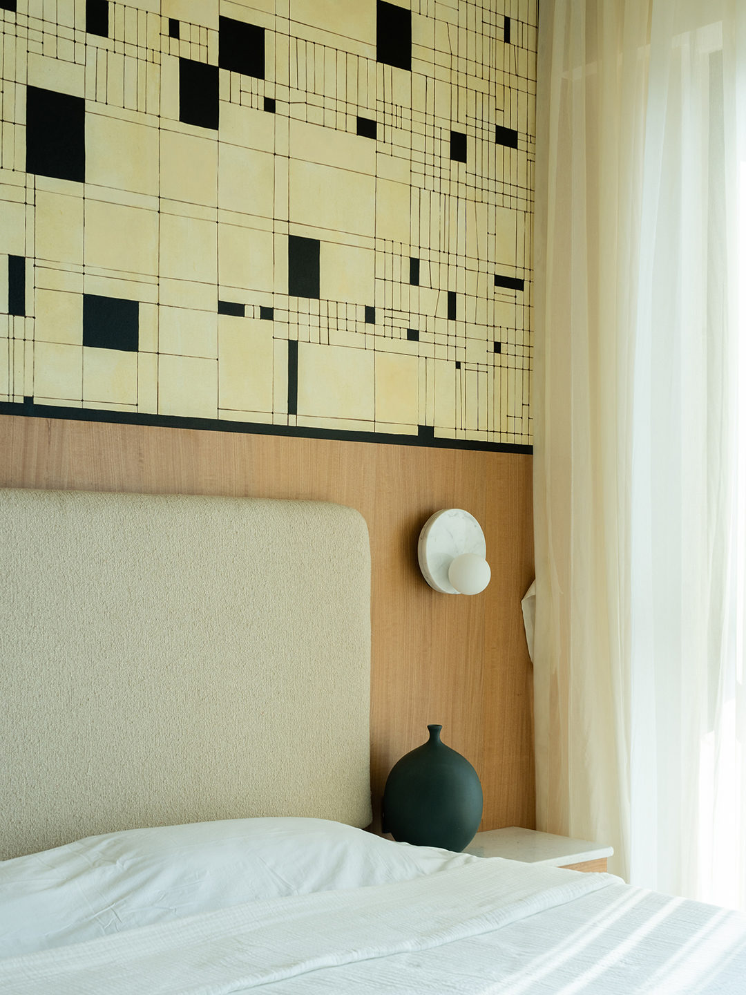 Despite strict building regulations that limited major renovations, Gandhi and Gadhia reorganized the layout to maximize the sun-drenched living and dining rooms. Along a narrow corridor, they tucked away the kitchen, primary and guest bedrooms, and a nursery for the Bhutdas’ son. At the end of the hallway is an art-adorned door that conceals golf gear and 55 pairs of sneakers.
