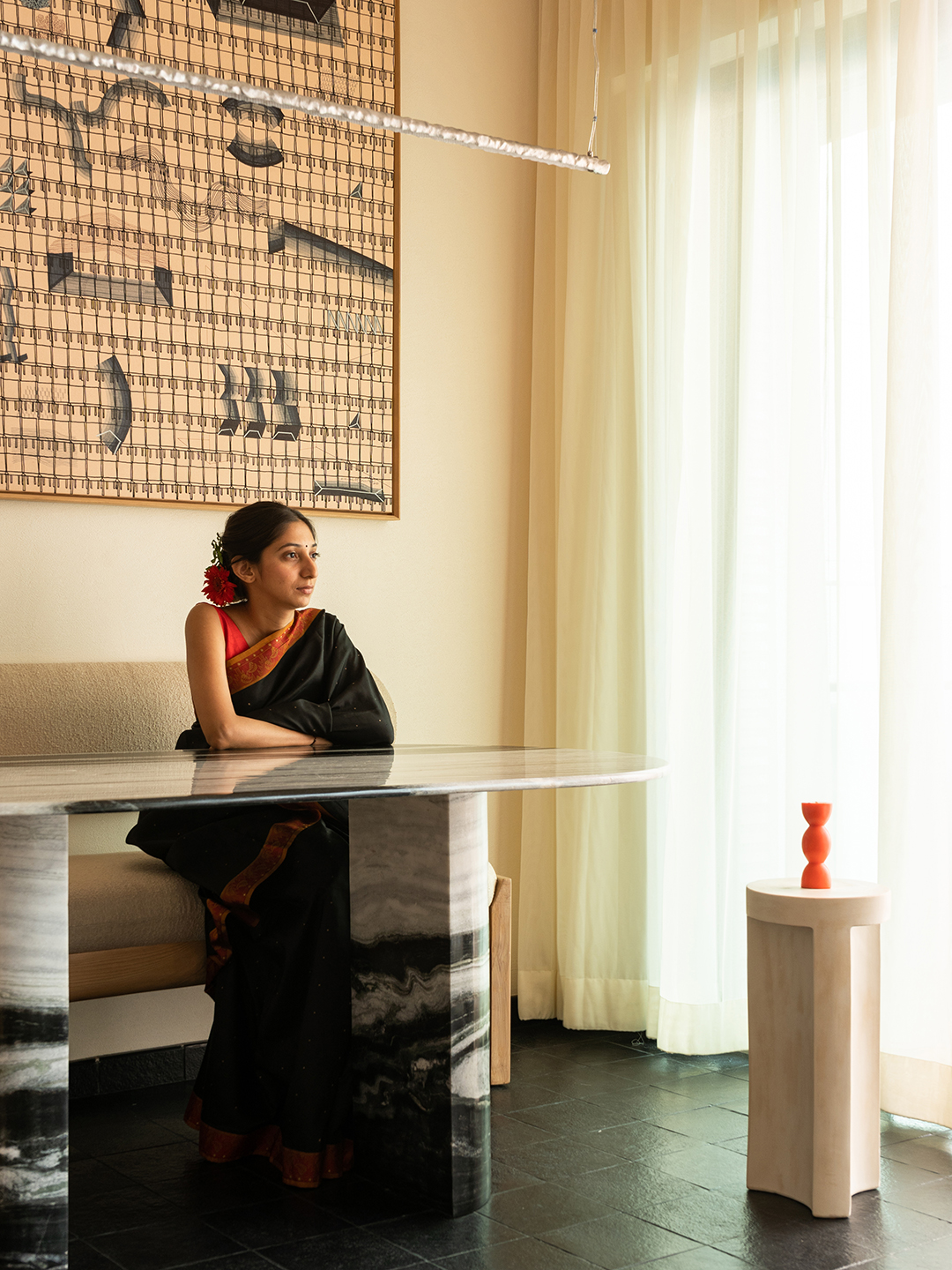 At the heart of Studio GaGa’s design process is a “discovery” session: They spent a few days shadowing the Bhutdas, observing their daily routines, preferences, and quirks. “Anushri’s love for the color orange was evident from the moment she walked into the first meeting. It was her midnight orange bag (and the stunning sunsets) that inspired the entire palette,” says Gandhi.