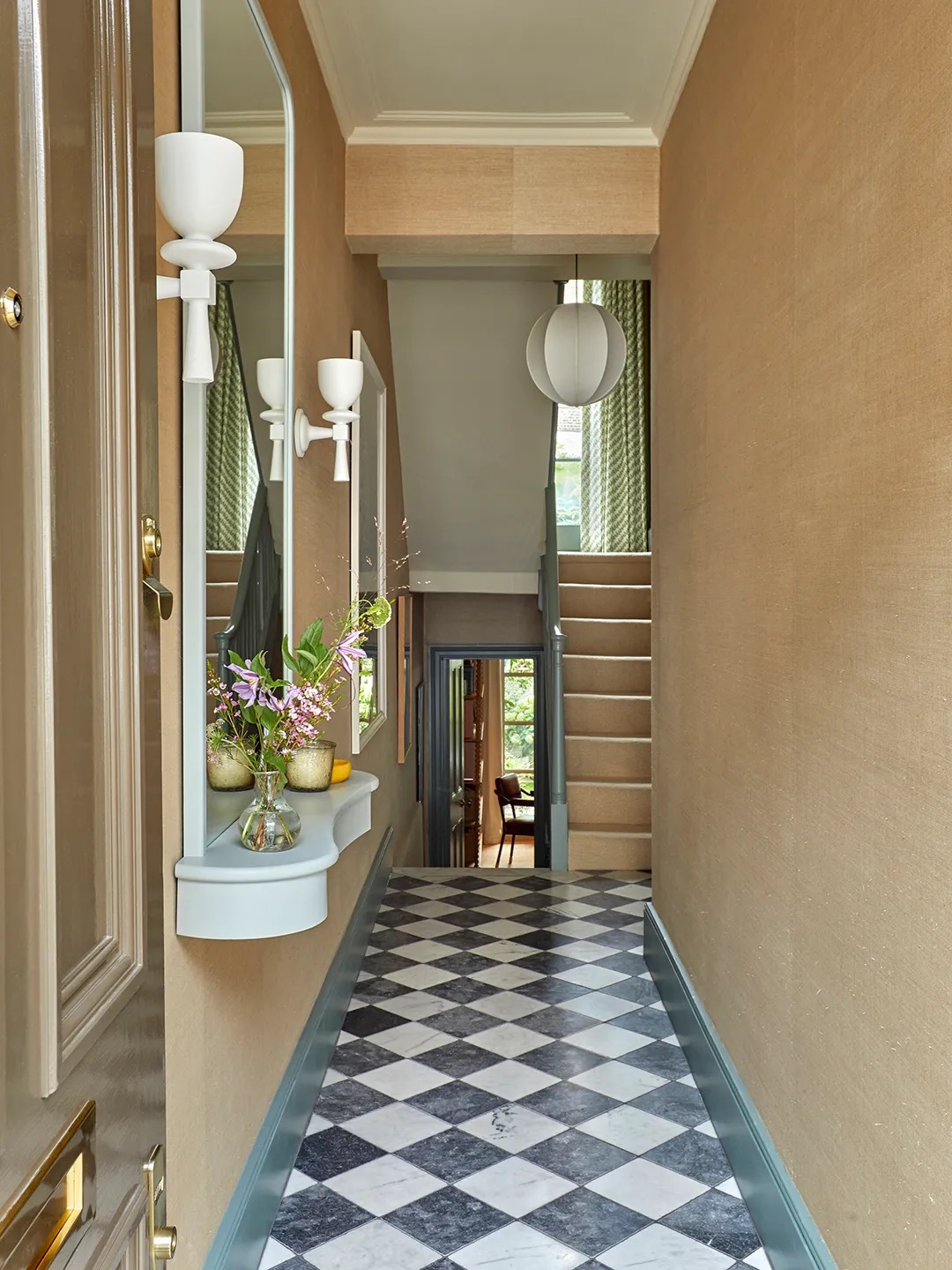 Bold stair runners are a theme here, which, in my case, I’m simply translating to a graphic floor runner. Stephens’ logic for this project was to enhance the beauty of the original floor tile by layering in a different pattern. “It’s a bit daring, but that’s what makes it work,” she says. The designer kept things feeling down to earth by painting the stairs in Farrow & Ball’s Pigeon, a soft green-gray, and bringing in a brighter console table from Rose & Grey.