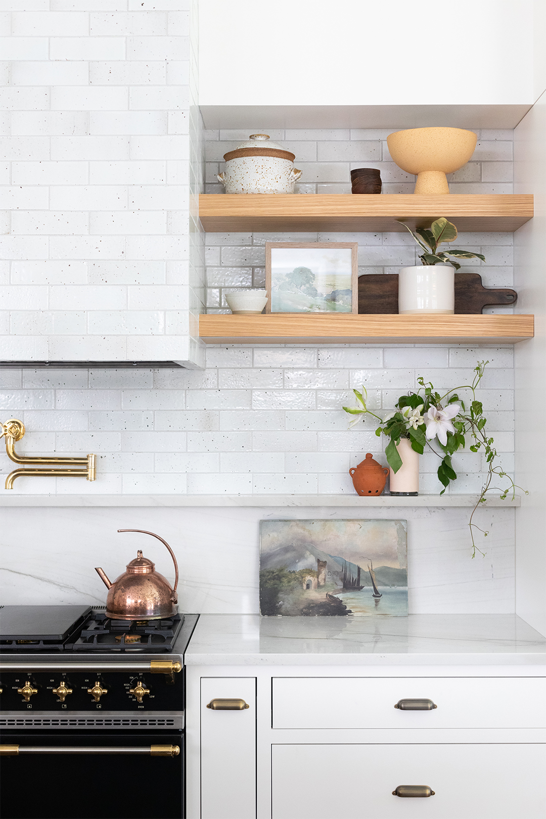 In the kitchen, where the layout changed slightly to accommodate a bar, the oak island inspired the countertops and open shelving—but the matching stops there. Leather-wrapped stools contrast the darker wood, and bright white cabinets and subway tile create a clean slate. The light fixtures, Lacanche range, unlacquered brass fixtures, and barstools weren’t exactly inexpensive, but nearby in the breakfast nook, a CB2 fixture that Francis scored for $90 lights up the room.