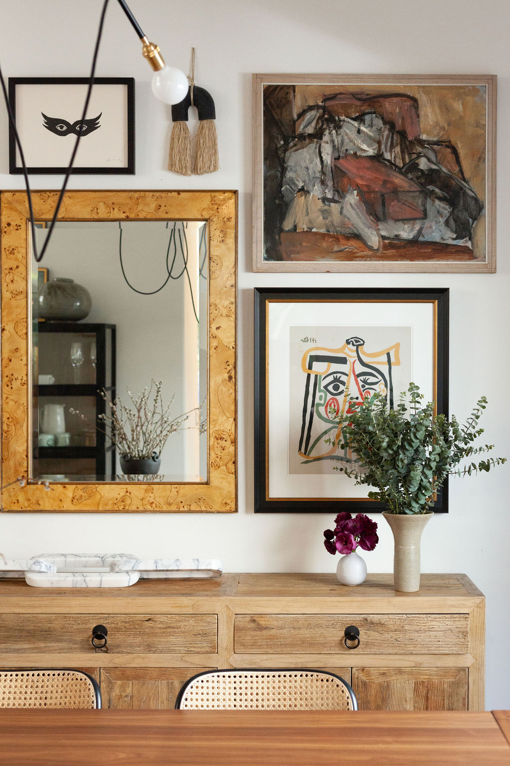 To be fair, not even her clients were sure if placing burl wood next to a walnut table and lighter oak console would be winning combo. “I wish I had an equation of how I would explain it,” says Francis. “For example, I wouldn’t have just mixed burl wood with anything, but I knew we were going to do that crazy gallery wall with reds and modern aspects to it, so I knew it would work.” In other words, throw out the rules; we have no use for them here.