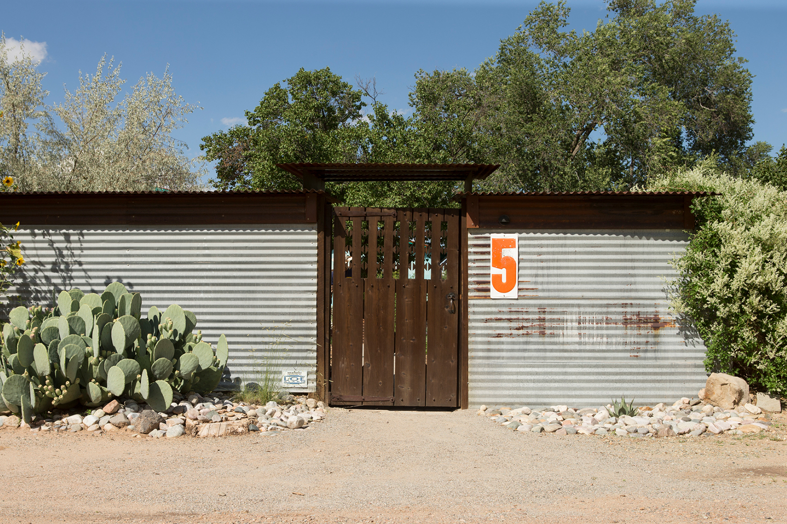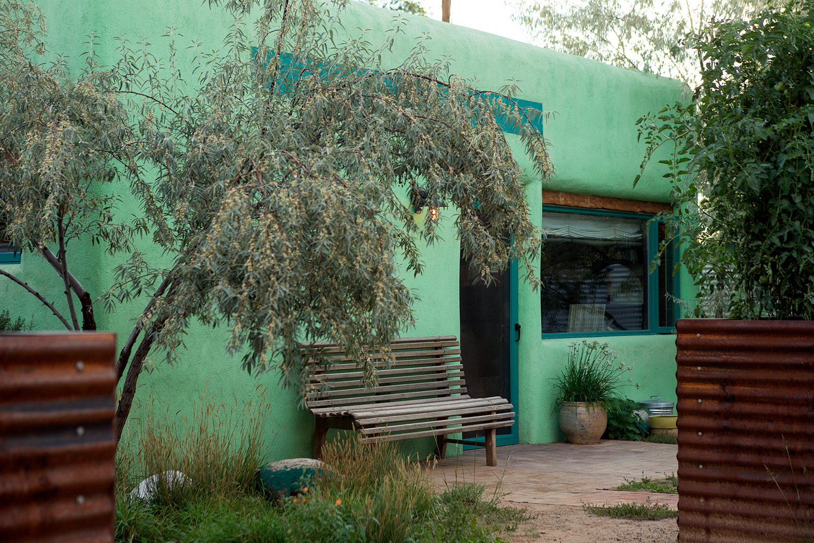 Like any newbie, Steele would take long walks around the small village to get familiar with the surroundings—and to investigate what materials other homeowners in the area had used. Upon stumbling upon an old, abandoned barn, she fell in love with the way its corrugated tin walls had aged over time and immediately ordered sheets to construct her property’s fence. Rather than keep the sheets vertical (the standard orientation), Steele turned every panel horizontal to maximize the shadow lines they create in the evenings. “I planted old electrical poles between each section so I could stagger them,” she explains. “The most magnificent thing about living in New Mexico is watching the light.”