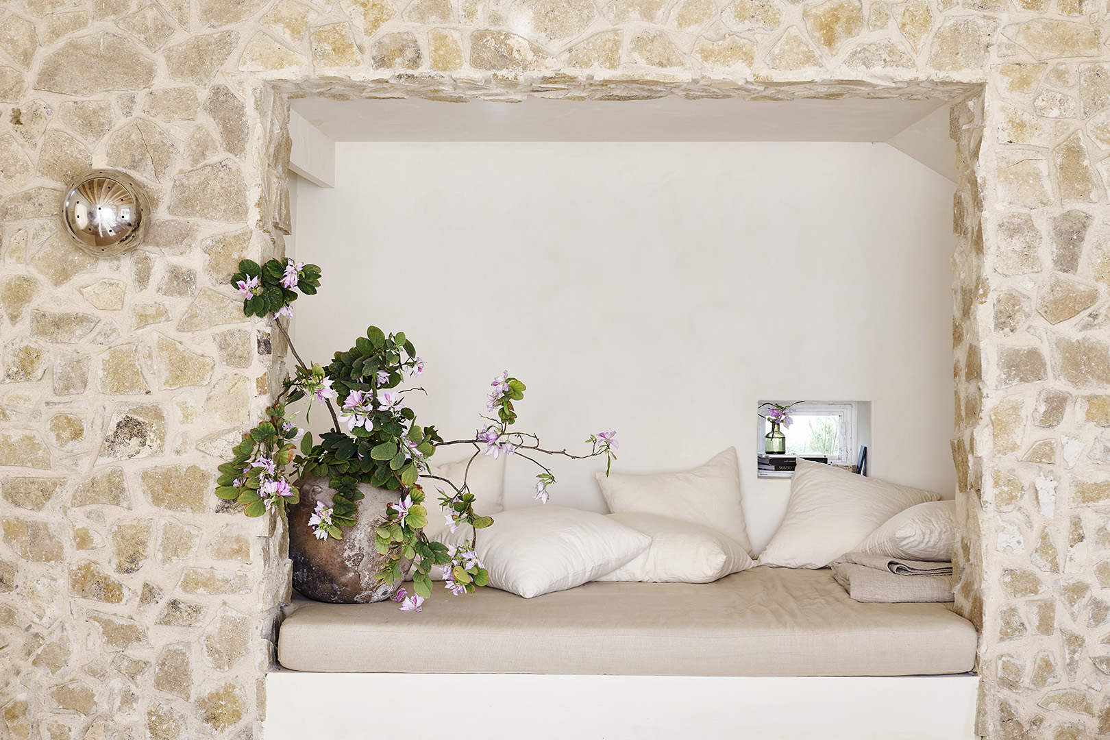 As a home meant to host private fasting and Ayurvedic retreats, Scalesciani-Hawken gave every space a spalike energy. She strictly sourced all her materials from nearby hills or quarries in the area, and she clad the walls and floors in polished cement, onyx pebbles, and 6-foot slabs of limestone similar to those found in old homes in Puglia. The same rule applied to decor. Aside from a handful of vintage Italian fixtures, all the furniture was designed by her and made locally or found at shops in the area. Even the massive tree trunk in the living room, which is cut to resemble the shape of a heart, came from a nearby olive grove.