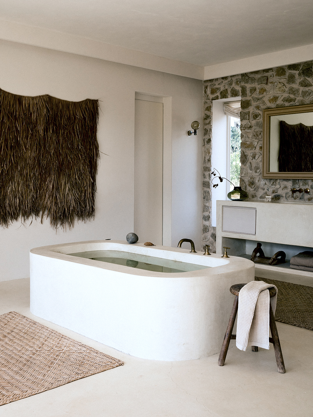 Unlike Ponis, Scalesciani-Hawken didn’t find any cool rock formations in El Pescadero, but she did discover something else: boulders hidden beneath the earth that she excavated and placed in various parts of the residence. Some are used as stepping stones inside the pool, others as stools to lounge on. There are even a few that serve as platforms for fireplaces and embellishments for walls. As she explains, finding each one a home took some thinking—and a mighty team of 10. “I needed to intuitively listen to each rock and learn where it wanted to live. Sometimes the final look of the room surprised me and was guided more by the stone telling me where it wanted to land rather than me making it fit into my vision,” reflects the designer.